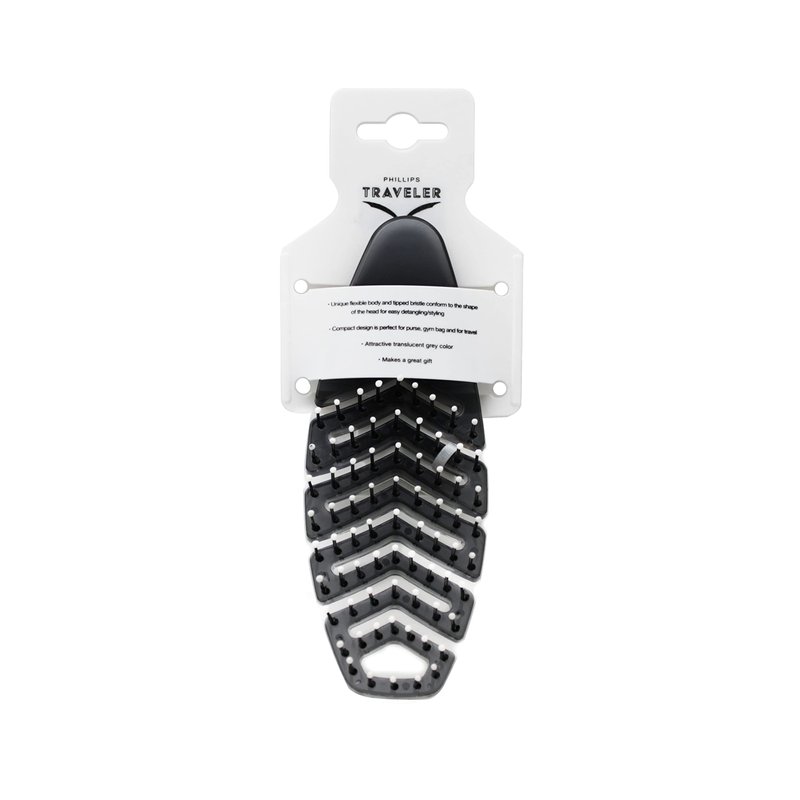 Salon quality hair care and maintenance while you are on the go is finally possible with the sleek and conveniently sized Traveler Brush by Philips Brush Co! The unique 'zig zagging' body of the Traveler allows it to bend and contort to the true shape of your head. This makes using the brush significantly more comfortable on your scalp and helps to detangle knots in your hair with less pain than a traditional, stiff brush. Brush body itself is slightly curved to match the natural shape of the human palm, creating a naturally ergonomic and comfortable hold. All these great features are wrapped in a brush that measures less than 7 inches in length, making it the perfect addition to your purse, travel bag, or even gym bag! Ideal for the non-stop, on the go lifestyle. Brush measures 6.5 x 2.25 x 1.25 inches, weighs 2.15 ounces. Designed and manufactured by Philips Brush Co: Trusted by Families and Professionals.