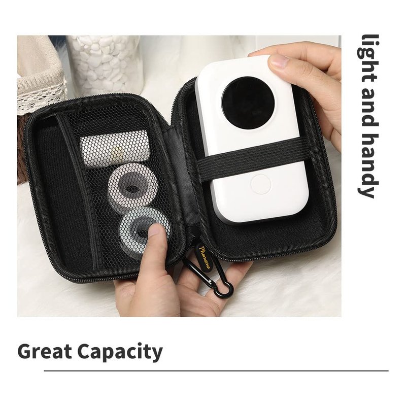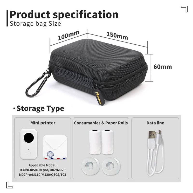 - [Storage bag size]- 100mm*150mm*60mm, can accommodate a printer and a small amount of paper rolls and an USB cable. Phomemo Mini Hard Shell Protection Box is waterproof, dustproof and shockproof. It has a built-in storage compartment and a bumper belt to effectively protect the printer from damage.