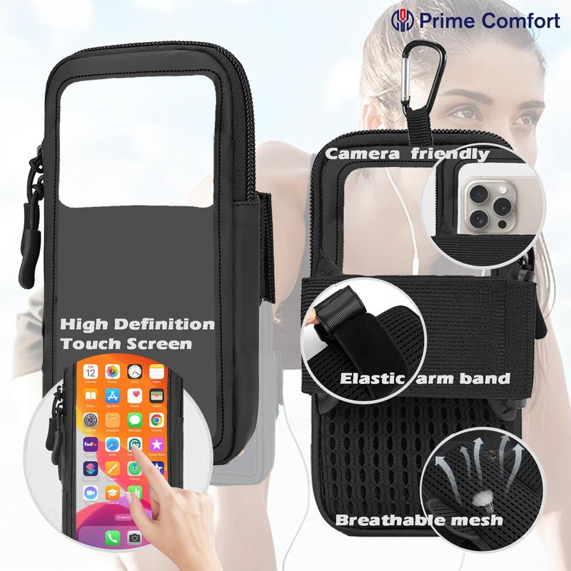 Prime Comfort Cell Phone Bag Armband, Small Crossbody Casual Shoulder Holsters Bag, Fits iPhone and Android, Use for Running, Walking, Hiking & Biking (Clear Black) This cell phone crossbody bag can be used as a travel passport bag, belt bag, phone arm bands for running, hanging on the backpack outdoor easy to take the bag. Waterproof PU on the front surface of the cell phone purse is suitable for beach, gardening, walking, traveling, workout,fitness, jogging, biking, fishing, running, etc. The shoulder strap of the cell phone crossbody bag can be easily adjusted. When it is used as a sports armband, the arm belt can be adjusted for all persons. Size: 7.1*3.7 inches, compatible with most cell phones, including all iPhones and most Samsung phones, the maximum size of the phone is 7.5 inches. This crossbody phone bag can be used as a sports arm bands, it has cushioned pads on both sides to keep your arms comfortable. This small crossbody bag for women or men. It has two zippers, a detachable shoulder strap, and a detachable hook. It is perfect for carrying cell phones, travel cards,coins, keys, and ear buds. The ultralight bags with secure shoulder straps make it easier to carry things while we walk and can keep our hands free. Multipurpose Use: - A sports armband - A cell phone crossbody bag - A cell phone purse - An outdoor hanging anywhere small bag Compatible Devices - Smartphones, Headphones Brand - Prime Comfort Material - PU