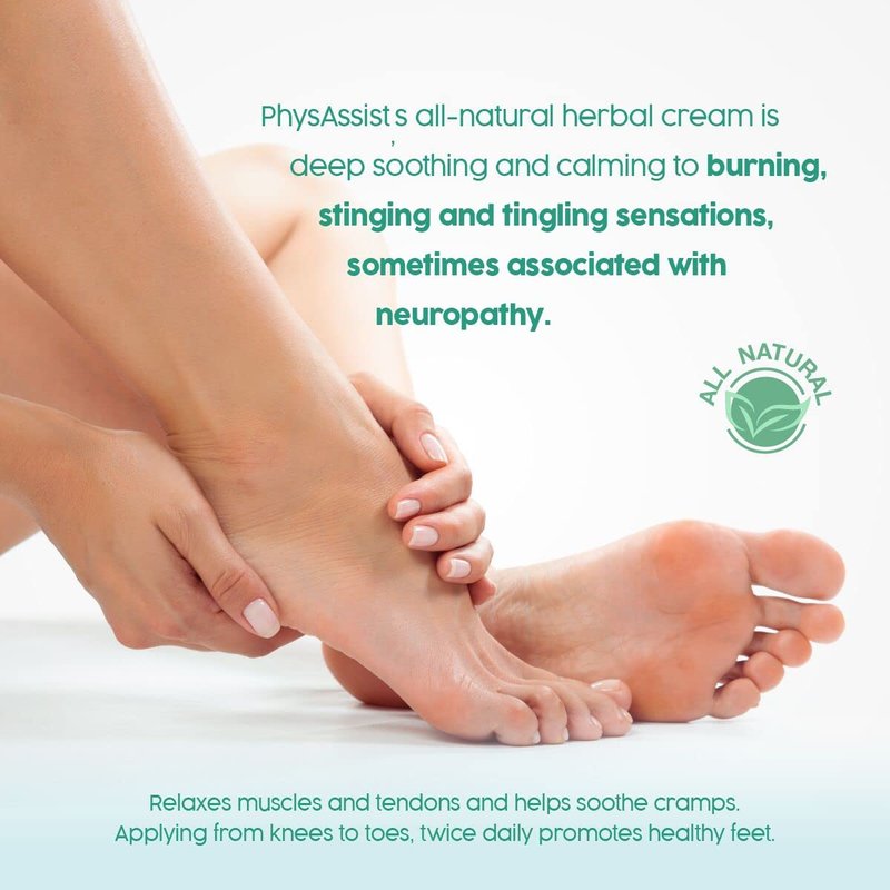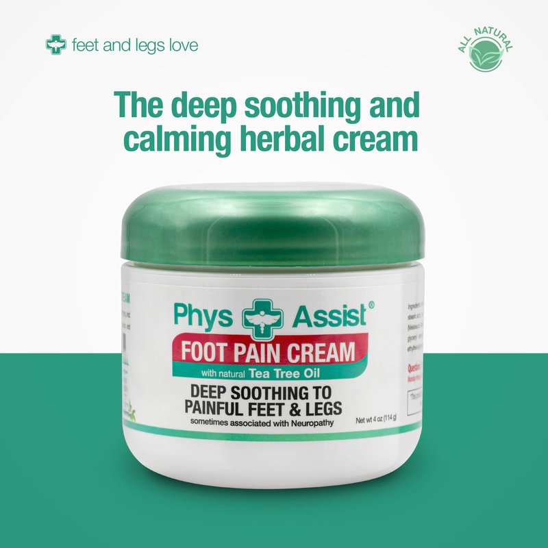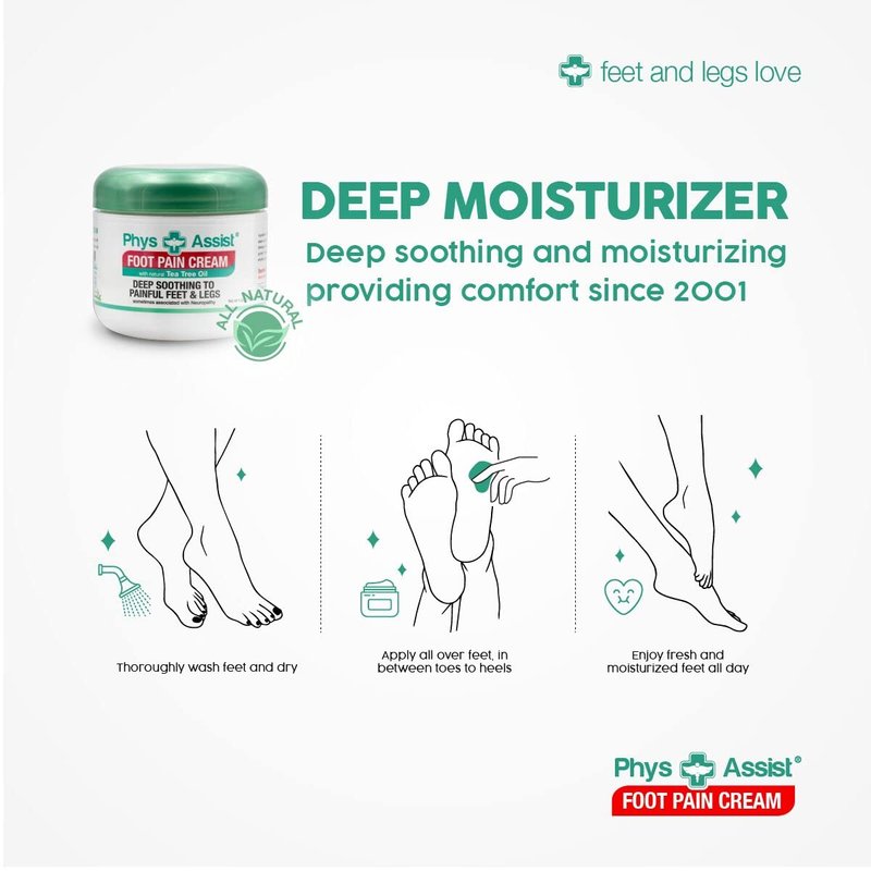 - Offers deep soothing comfort to feet and legs with hydration. Deeply moisturizes leaving feet feeling renewed and invigorated. Natural ingredients; this precision-made formula contains natural oils and extracts of Tea Tree, Peppermint and Arnica along with Glycerin Jojoba Oil and Vitamin E. heels. This reach cream is easily absorbed non- grease and offers a clean fresh scent leaving feet and legs feeling refresh and rejuvenated. Physassist foot cream is free of alcohol, paraben and color