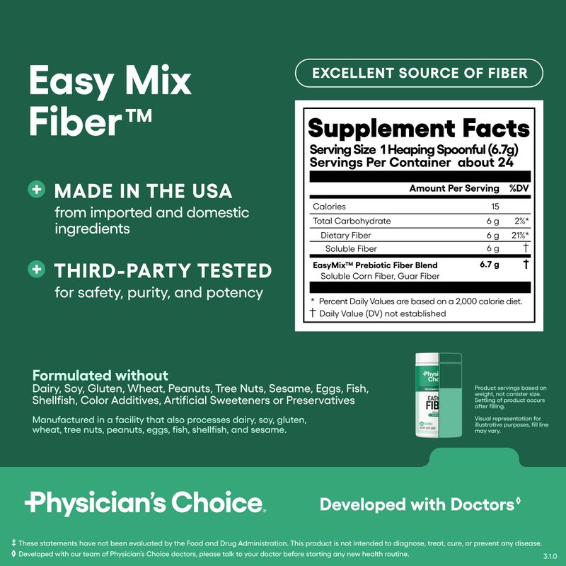 Physician’s Choice Easy Mix Fiber – This daily fiber powder supports healthy digestion, balanced hunger, regularity, and overall gut health with 6 grams of natural prebiotic fiber per serving. Developed with doctors to help you get the fiber you need in a way you will actually enjoy using. Easy to Mix and Easy to Love: Formulated with soluble fiber that’s gentle on the stomach and blends effortlessly into hot or cold drinks without clumping or grit. Just stir, shake, or mix for 60 seconds. Your Probiotic Routine Needs This: Made with two clinically-studied sources of prebiotic fiber to help support the probiotics in your gut, promote healthy digestion, maintain regularity, and help you feel full between meals. The perfect dietary fiber supplement for adults looking to support their overall gut health. approx.1 month supply Not Your Grandma’s Fiber Supplement: Unlike psyllium husk fiber, this formula stays smooth in liquids and will not turn into sludge. No sugar or artificial ingredients, just an unflavored fiber powder supplement you can trust. Unmatched Quality: Easy Mix Fiber is 3rd-party tested for safety, purity, and potency. Manufactured in the USA with strict quality control - using imported and domestic ingredients.