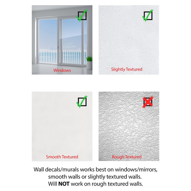 - Application is Fun and Removable: Our Decals can be applied on most flat surfaces, including slightly textured walls, mirrors, or any smooth surface. You can test this by applying a regular sticker on your wall, and if it sticks well, than our wall decals should work on your walls.