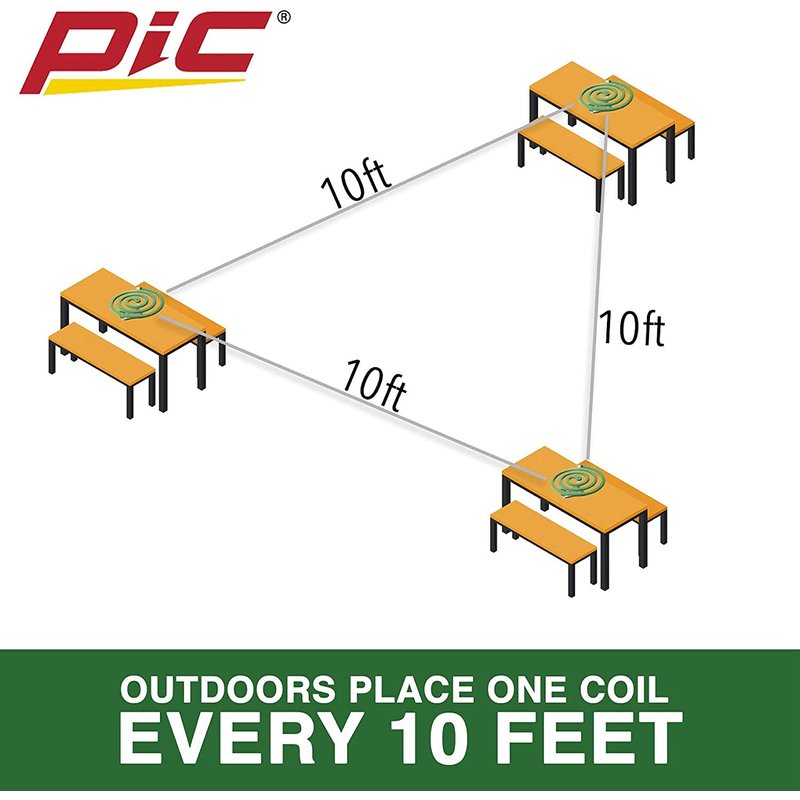 PIC Mosquito Repellent Coils contain a proven formula of Pyrethrum. Each coil lasts up to 5 to 7 hours. Comes with reusable metal stands. Mosquito Coils help repel mosquitoes in confined areas outdoors. It is useful in places where there is little or no breeze such as patios and porches. Do not use indoors and see packaging for additional instructions for proper use. Coils repel mosquitoes and are effective when positioned every 10 feet. Each coil burns for 5-7 hours and is best used outside on patios and porches. For outdoor use only. Use the enclosed metal holder for positioning the coil above the surface of your patio table or wherever you place the coil for repelling mosquitoes. Note the direction of any breeze or wind when placing the coil around outdoor activity.