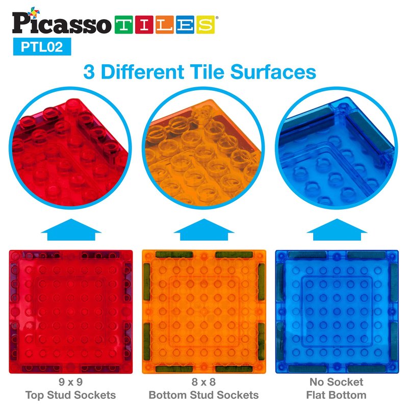 PicassoTiles 12 Pack STEM Creative Magnetic Blocks Magnet Tiles with Building Brick Construction Toy Socket Spikes Toys Accessory Educational Imaginative Learning Kit Stacking Set Boys & Girls Age 3+ DREAM BIG & BUILD BIG: No limitations, scalable to construct as massive as desired by adding more pieces to create a creatively engineered masterpiece. The 12 piece STEM learning educational construction tiles set can be used either as a magnet tile accessory kit or in conjunction with other PicassoTiles magnetic building blocks as add-on sets. The tile-set have been updated with stronger and improved magnets that have the strength to easily hold up to 8 square piece together in a large chain NEW MAGNETIC BRICK COMBO TILE- Introducing the magnetic construction tile that have upgraded magnets strength and featuring brick building connector spikes on the surface of all pieces to provide a perfect platform to build bricks creations or to connect your brick characters! Allow your children to be the first to combine magnet designs with block buildings helping produce bigger, greater innovative, and super creative cities, zoos, palaces, animals, island, houses, skyscrapers and much more! IMPROVED STRONGER MAGNET- Installed with new reinforced magnets, each magnetic tile can connect onto other tiles quickly and easily without losing connection and toppling over your masterpiece. Build bigger, taller, more creative and steadier structures that are stable and secure enough to hold together whatever imaginative designs you can fabricate! CREATIVITY BEYOND IMAGINATION, Create and engineer limitless varieties of castles, mansions, skyscrapers, towers, farm, shapes, animals and more! DREAM BIG & BUILD BIG- This 12 pc toy playset comes with two different style socket tiles, a 9x9 top spikes with a flat bottom surface and a 9x9 top spike with 8x8 bottom sockets. This mix & match sensory learning toys encourage creativity by allowing boys and girls preschool ages 3+ to construct unique and imaginative brick designs that can be scalable, while fostering early children STEAM (Science, Technology, Engineering, Art, Math) education, hand-eye coordination and problem solving skills PREMIUM QUALITY- The construction building bricks magnetic tiles are made using safe high quality durable materials that will not break easily and can last a lifetime of entertaining and creative kid's fun! Each piece can be washed and cleaned for endless game time without losing the quality constructability or washing away the color. From the smallest to the largest, each unique tile was created with innovative design to fit perfectly with other pieces and is a great size for little hands! FEATURING NEW MAGNET BRICK COMBO TILE- Combine magnetic tile fun with building construction bricks with these new magnet tiles that feature block sockets to connect brick pieces onto each of the magnets. Build bigger and more creative ideas with this innovative combination tile OPEN-ENDED POSSIBILITIES, BONDING BY PLAYING- Creativity beyond imagination, PicassoTiles construction magnet tiles offer both 3D and 2D endless creative combinations and learning opportunities for all ages (3+ and up), single player or multiplayer in groups such as preschool, pretend play, teamwork, kindergarten and parties to feel the sense of achievement together. Easy to construct and quick to put away for storage. No limitations, scalable to build as big as desired by adding more blocks and bricks to create your masterpiece. PREMIUM QUALITY- The magnet tiles are made to be non toxic and durable enough to create large buildings and last a lifetime while also featuring smooth edges that are great for kid's hands! Wash and clean the pieces for endless playtime without losing the constructability or washing away the color of each piece. DIY CREATIVE ABILITY- Allow kids to develop their imagination and creativity by assembling large structures using the different colors and unique brick shapes included in the playset while also fostering visual learning, a strong sense of color, geometrical shapes, logic number counting, and 3D architectural design. COMPATIBLE & GUARANTEED TIGHT FIT- These bricks fit tightly with other regular building block sets to make combining brick kits fun and easy! In The Box: - 6pcs of 9x9 top studs with a flat bottom surface magnetic tiles - 6pcs of 9x9 top studs with 8x8 bottom studsmagnetic tiles
