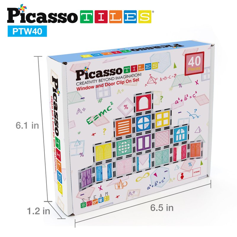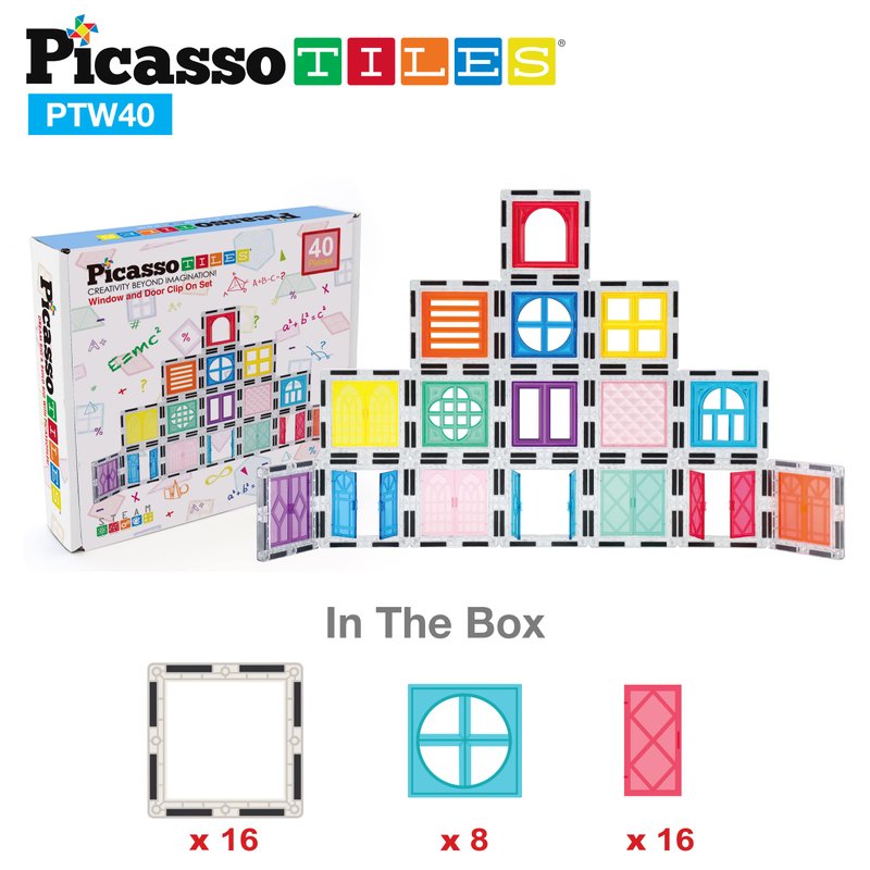 PicassoTiles 40 Piece Window and Door Clip On Magnetic Blocks Magnet Tiles Magnets Building Tile Construction Toy Set STEM Education Toys Learning Kit Stacking Block Playset Boys & Girls Age 3+ PTW40 DREAM BIG & BUILD BIG- No limitations, scalable to construct as massive as desired by adding more pieces to create a creatively engineered masterpiece. The 40 piece STEM learning educational construction tiles set can be used either as a stand alone magnet tile kit or in conjunction with other PicassoTiles magnetic building blocks as add-on sets. The tile-set have been updated with stronger and improved magnets that have the strength to easily hold up to 8 square pieces together in a large chain SWAPPABLE MAGNETIZED CLIP ONS- The magnetic set comes with 8 window and 16 door flap clips on pieces that can attach onto each square tile. Changeable clip-in inserts allow for kids to build bigger structures with operable windows and doors perfect for any princess castle, dream house city building, farmer's barn, skyscraper or whatever construction buildings your child can creatively imagine. Every clip-on is child-friendly and can be attached easily by snapping them into the magnet tiles piece IMPROVED STRONGER MAGNET- Installed with new reinforced magnets, each magnetic tile can connect onto other tiles quickly and easily without losing connection and toppling over your masterpiece. Build bigger, taller, more creative and steadier structures that are stable and secure enough to hold together whatever imaginative designs you can fabricate! CREATIVITY BEYOND IMAGINATION, Create and engineer limitless varieties of castles, mansions, skyscrapers, towers, farm, shapes, animals and more! LEARNING BY PLAYING- Never too young to start developing children’s S.T.E.A.M. skills from visual training, strong sense of color, motor skill, geometrical shapes, mathematics, numbers counts, magnetic polarities, 3D architectural design to even structural engineering at an early age! Keep children occupied for hours of fun, making preschool education exciting for kids boys & girls or toddlers to create any size masterpiece with this perfect educational gift present that won't go out of style! BPA-FREE & NON-TOXIC- PicassoTiles Magnetic STEM learning clip on tiles construction toy set is made child safe and lead free. Each building piece is tested to ensure quality and safety for toddler, educational purposes, indoor/outdoor constructing and more. BONDING BY PLAYING - Entertaining for single or multiple parties and feel the sense of achievement together. Suitable for all ages (3+ and up) by one party or in groups as a great way to spend exciting play time with family and loved ones. Features EASY & QUICK CLIP-IN TILES- The clip in pieces can easily be installed into the magnetic tile by anyone, even small children's hands! Attach and detach windows and door flaps quickly to upgrade any imaginative build design! CREATIVITY BEYOND IMAGINATION- Allows kids to acquire strong sense of color, motor skill, geometrical shapes, magnetic polarity, mathematics, numbers counts, 3D architectural design, to even structural engineering! Magnetized clip-in tiles enable children to work independently on metal or magnet surfaces in both outdoor and indoor areas to build bigger and construct their dream masterpiece! - Fun and entertaining, perfect early education toy kit for school age toddlers that will never go out of style. Enjoyable for single or multiple parties, great for parent-to-child bonding with hours of recreational quality time. Inspire others with your uniquely constructed magnetic building tile design and challenge friends and family to create something amazing. INSPIRATIONAL and lead-free materials that are tested to ensure quality and meet safety standards for children to play freely MADE OF CHILD SAFE, NON-TOXIC, BPA-FREE - Bring out the best in anyone to be artistic, creative, technical, architectural, intelligent and scientific all at once. Construct amazing animals, shapes, skyscraper structures, mazes, puzzles, or any DIY creation your child can imagine! Skim through the PicassoTiles Ideabook (Not included, Sold Separately) for over 150+ interesting ideas to build and add to your current designs! OPEN-ENDED POSSIBILITIES In The Box - 16 Clear Magnetic Tiles - 8 Window Clip-in Pieces - 16 Door Flap Clip-in Pieces