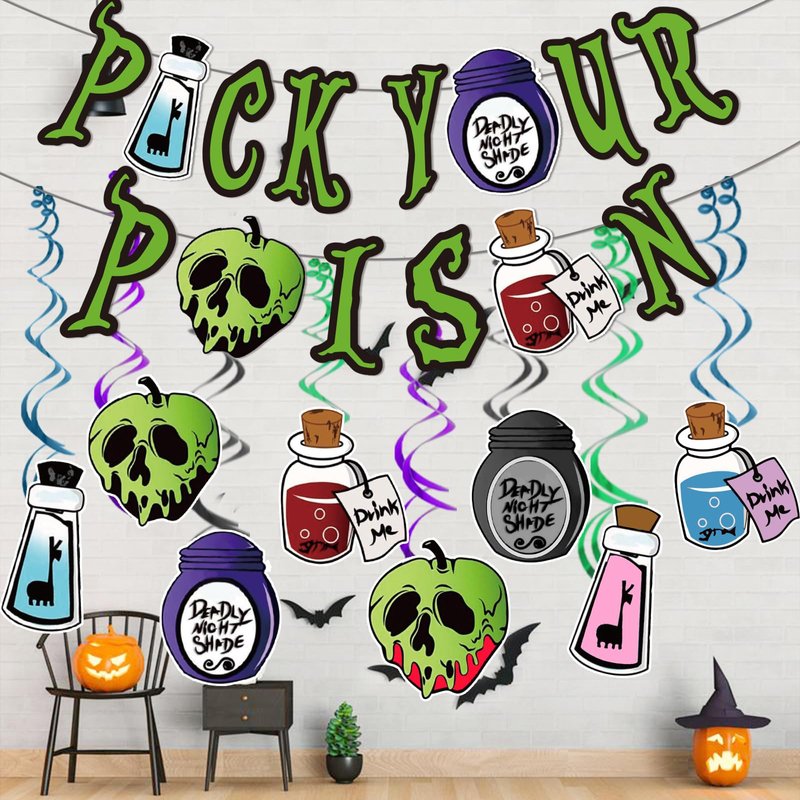 - 👍【Specially designed for Halloween party banner supplies】 The "pick your poison" banner, including the unique witch potion logo, witch theme and letter design, creates a spooky scene for the party and makes you more Close to the atmosphere of a party Halloween. This is a great choice for Halloween horror parties and haunted house decoration banners.