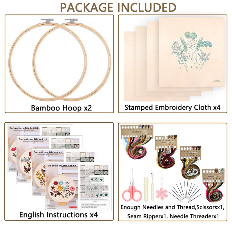 - Valuable Hand Embroidery Set:You will get 4 pcs embroidery cloth with the pattern,2 pcs embroidery hoops, 1 pc scissor, color embroidery threads,embroidery needles,English Instructions. You can finish a pretty embroidery with this embroidery starter kit.