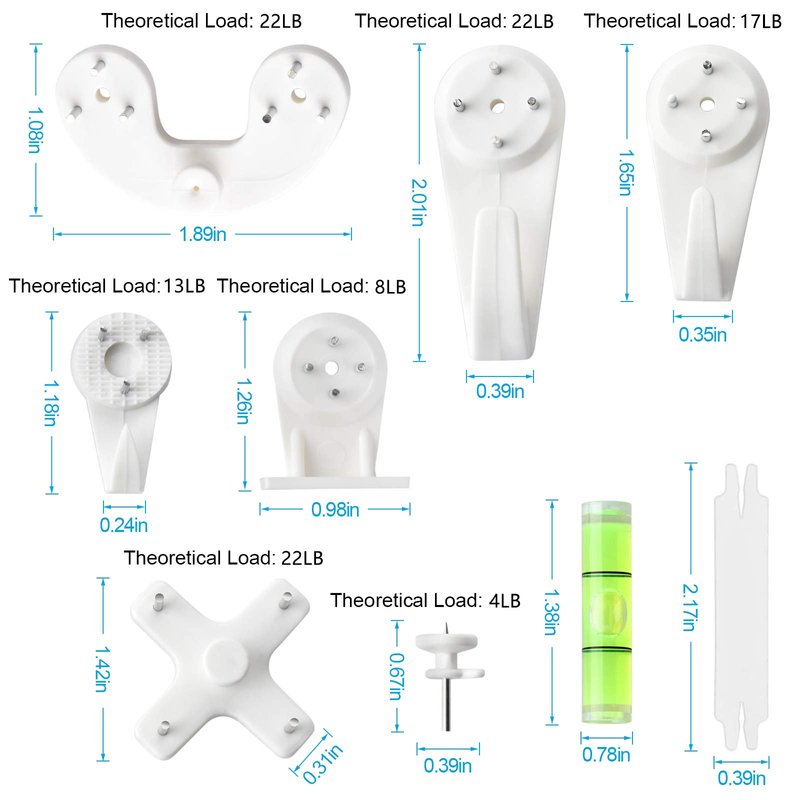 - PICTURE HANGER VARIETY PACK: Totally 62 pieces, 40 pcs small hanging nails(bearing capacity 4lb); 4 pcs medium wall hooks(13lb); 4 pcs large picture hanger hooks (17lb); 4 pcs extra large picture hanging hooks( 22lb); 4 pcs four footed concrete wall hangers(22lb); 2 pcs heavy duty frame hangers(22lb); 2 pcs auxiliary bracket for art picture frame(8lb); 1 mini level and 1 auxiliary clip.