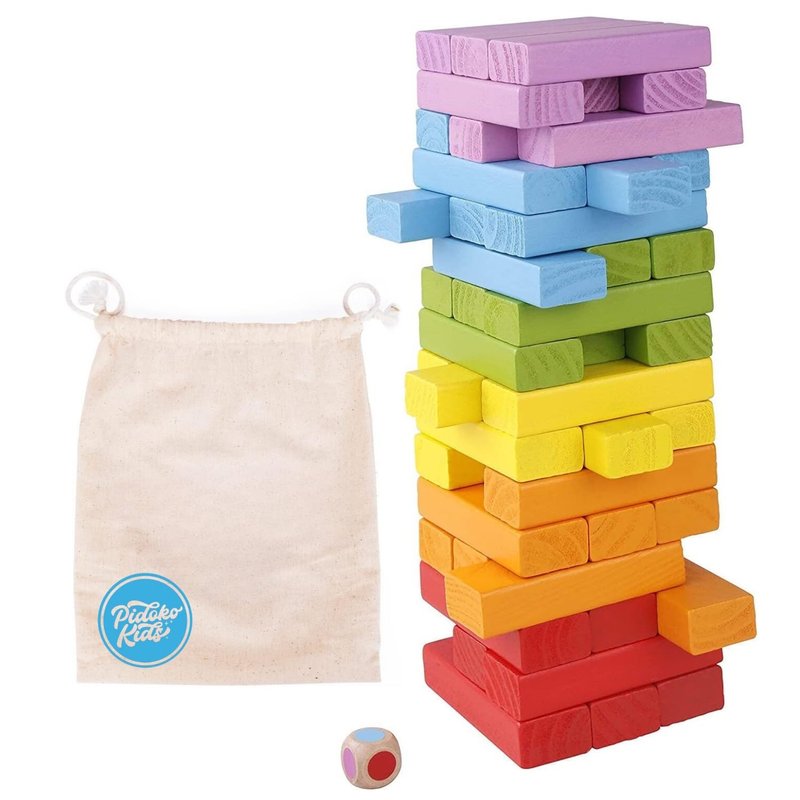 Enjoy the Classic Tumbling and Stacking Blocks Game by Pidoko Kids. Easy and Fun to play. Simply roll the dice when its your turn, remove the block matching the color on the dice, and place it on the top, without tumbling the tower! Player to knock down the blocks first is the loser! Cleverly designed, entertaining multiple children to play at a time, making this blocks set is an adorable addition to any home, nursery, playroom, schools, waiting rooms, and other child-friendly play area.