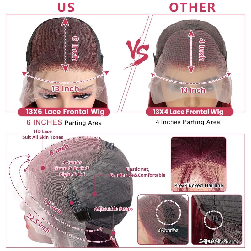 - 【Burgundy Wig Advantages】13x6 Hd Lace Frontal Wigs Human Hair Body Wave Wig Uses Swiss Lace Which Is More Comfortable,Transparent,Invisible,Durable For Long Time Use,And Highly Suitable for People of Different Skin Tones,Match All Color Skins,Breathable and Natural Hairline.