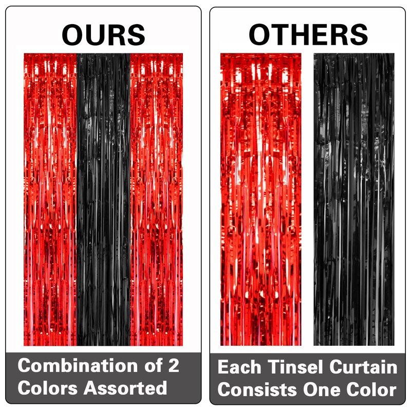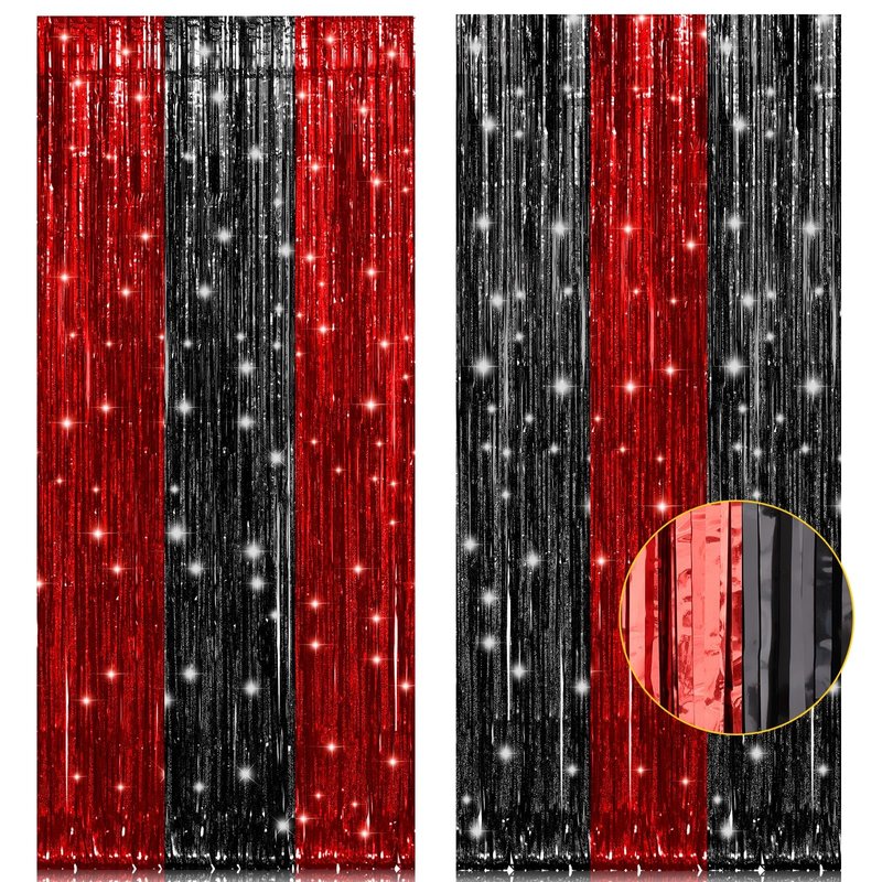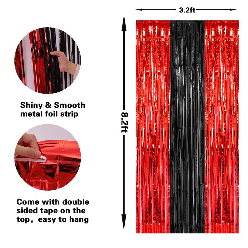 - 【Package Includes】Red Black Metallic Tinsel Foil Fringes Curtains. 2Packs/SET, enough quantity for your party decoration and save your money. Each pack foil curtain is 3.2ft x 8.2ft, enough length for decorating your party, and you can cut the tinsel by scissors into the suitable length and width for your party use. These 2 pack bling and sparkle tinsel curtains can be used for wonderful photo booth backdrop, Disco/Door Decoration/Stage Background, add shimmering color and texture to your party.