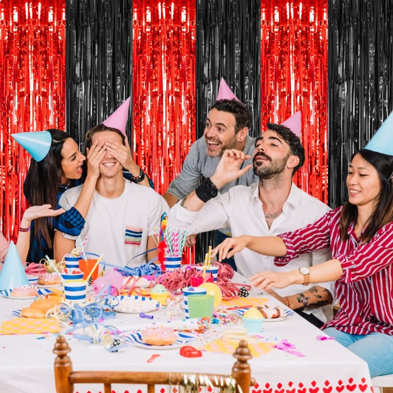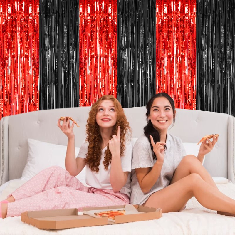 - 【Premium Quality】This classy Red black foil curtain backdrop is made of high quality tinsel with shiny surface, which will keep the shimmer effect all the time, so they can be reused for many times, and light up your parties every time. It is thicker than similar products, better quality, not easy to tear, non-toxic, odorless, and non-fading, safe for families with children and pets. This beautiful Red black fringe curtain will make your room, backyard, bedroom look special.