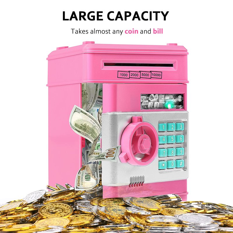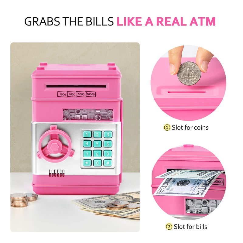 - For All US Coins And Bills : Large capacity money safe for kids, plenty of inside space for storage. A slot for coins and a slot for bills, this money saving box takes almost any coin and bill, ATM piggy bank for real money,l large enough to store some small trinkets too. Cool stuff for boys girls as girls boys toys gifts ideas.