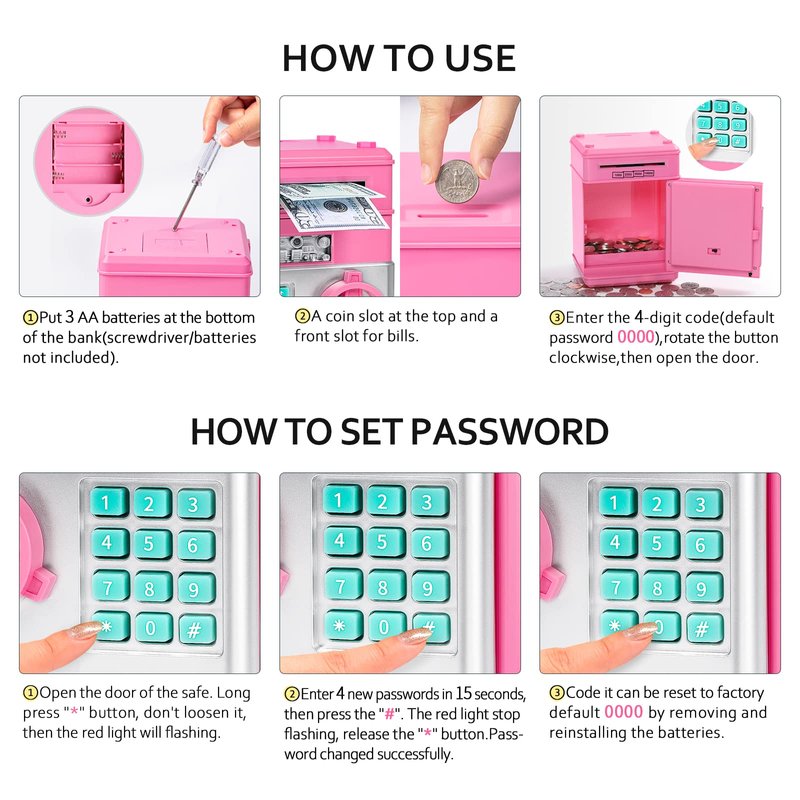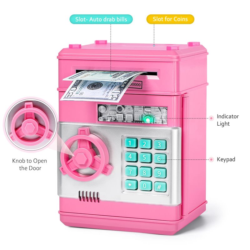 - Keep Safe Money: Open the door of the kids safe with 4-digit code(default password 0000). ATM piggy bank for boys, easy to program a personalized code, perfect for what your boys/girls needed to keep their money - safe! Kids will love hiddening their "valuables" in this coin bank.