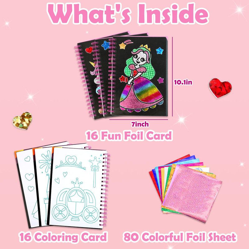- Foil craft creative activities: Kid foil craft brings a colorful and fun sensory experience, encouraging children to express and improve fine motor skills; Help toddlers improve children's creative thinking, concentration, imagination, eye-hand coordination, and hands-on ability; Kids can use cool foil craft set to create 16 unique pieces of art featuring Princess, Unicorn, Mermaid and Castle.