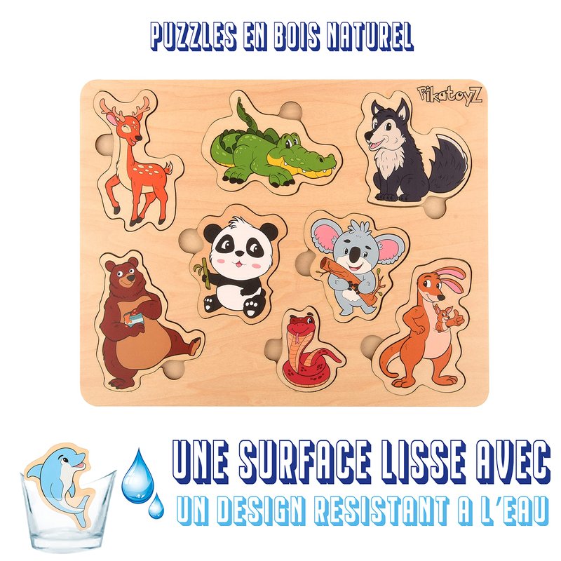- LEARNING AND DEVELOPMENT: The PikatoyZ puzzle collection cannot be complete without the theme of wildlife. That's why we designed these wooden puzzles with bright colours and identifiable designs for babies and children aged 1 2 3 years. A wooden baby toy made up of 8 pieces allowing the reduction of addiction to smartphones while helping to learn in a fun and fun way.