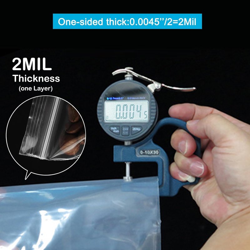 - Specifications : The size of these small plastic bags: width=2''/50.8 MM, length=2.2≈2"''/57.2 MM. The measured double-sided thickness is 4.0 Mil (the single-sided thickness is 2 Mil=0.002"), 100 count transparent small ziplock bag in per package