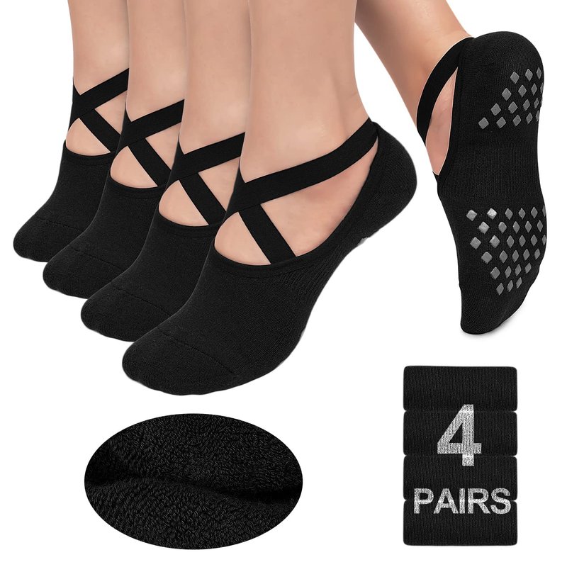 Pilates Socks Yoga Socks with Grips for Women Non-Slip Grip Socks for Pure Barre, Ballet, Dance, Workout, Hospital,4 Pairs Black,L-XL