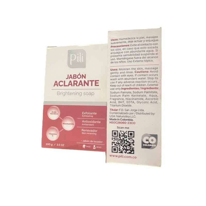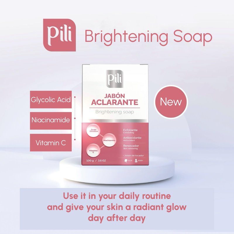 Experience the transformative power of Pili Brightening Soap, the perfect complement to your routine for even-toned skin. Crafted with a potent blend of Glycolic Acid, Vitamin C, and Niacinamide, this soap bar is the key to achieving a luminous complexion. Say goodbye to stubborn dark spots with our Brightening Soap Bar. The dynamic trio of Glycolic Acid, Vitamin C, and Niacinamide works synergistically in your routine to diminish pigmentation, revealing a brighter, more uniform skintone. Elevate your skincare routine with our Facial Skin Brightening Soap. Infused with Vitamin C, it acts as an illuminator, revitalizing dull skin and restoring its natural radiance. Say hello to a glowing, rejuvenated complexion. Unveil smoother, softer skin with our Exfoliating Soap Bar. Gentle yet effective, it gets rid of dead skin cells, leaving behind a renewed and refreshed face. Embrace a smoother texture and a more youthful appearance. Protect your skin against environmental aggressors with our Antioxidant-rich formula. Shielding your skin from free radicals, it helps maintain its youthful vitality and resilience. Indulge in daily renewal with our Skin Renewing Soap Bar. Nourishing and regenerating, it replenishes the skin's moisture barrier, promoting a healthier, more vibrant complexion. Transform your skincare routine with Pili Brightening Soap and reveal the luminous, even-toned complexion you've always dreamed of. Simply wet the skin, lather, and rinse for effortlessly beautiful results. Unlock the secret to radiant skin today.