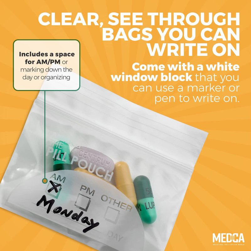 - ✔ CLEAR SEE THROUGH BAGS YOU CAN WRITE ON: These bags are clear and large so you can see exactly the contents of what is inside. The MEDca pill container bags also have a white window block that you can use a marker or pen to write on. Including a space for AM/PM or marking down the day or organizing