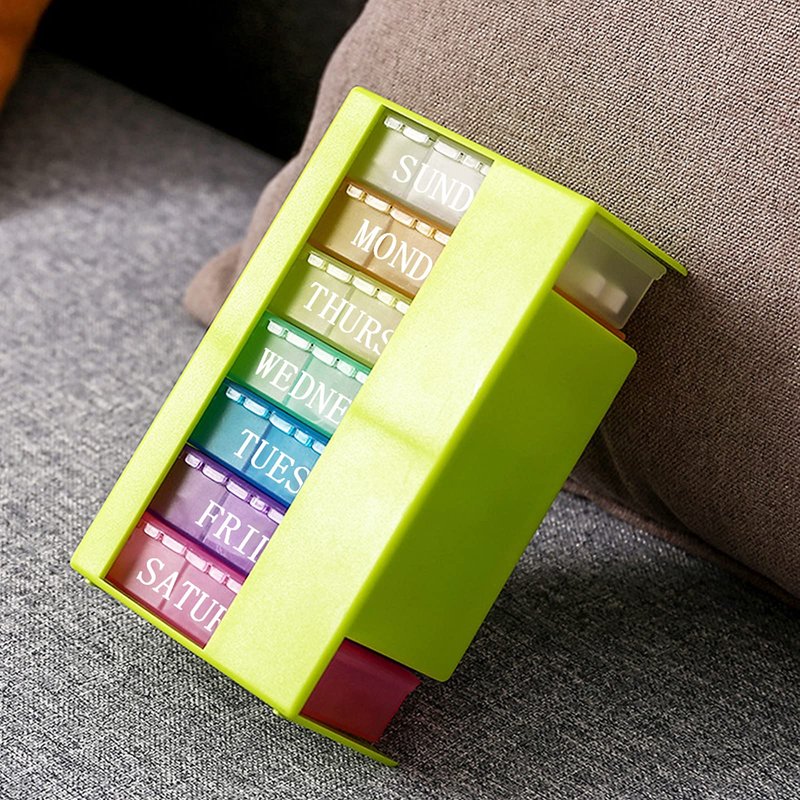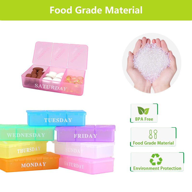 - BPA-Free : Pill organizer 7 day adopt food grade pp material for health care and medical use. Translucent materials make it easier to tell if you've taken a medicine without opening the box.