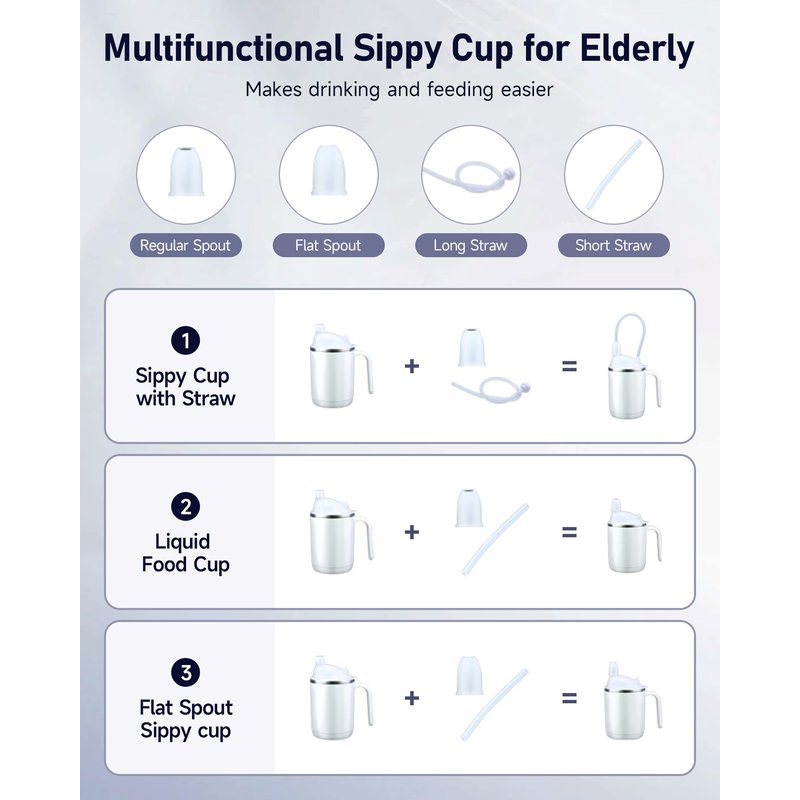 - Multifunctional - Makes Drinking and Feeding Easier: This thoughtfully designed sippy cup for the elderly is equipped with two straws & two spouts, which help seniors to drink water or consume liquid food. The flat spout provides precise liquid control, aiding those with swallowing difficulties