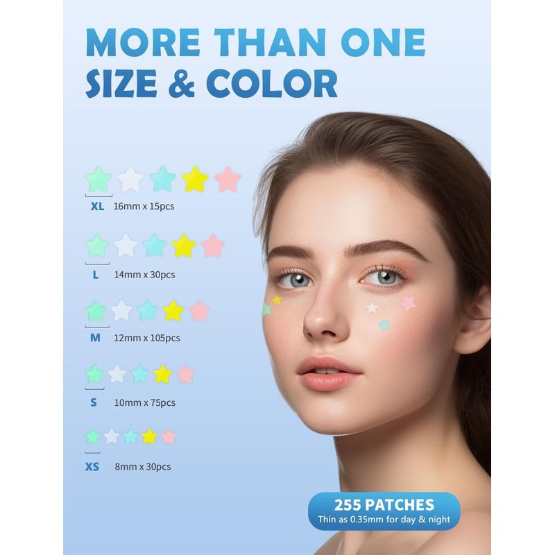 Pimple Patches for Face, 255 Pcs 5 Colors & 5 Sizes (8,10,12,14,16mm) Hydrocolloid Acne Patch Precise Matches Acne of Different Sizes, Cute Star Spot Stickers With Tea Tree, Salicylic Acid & Centella