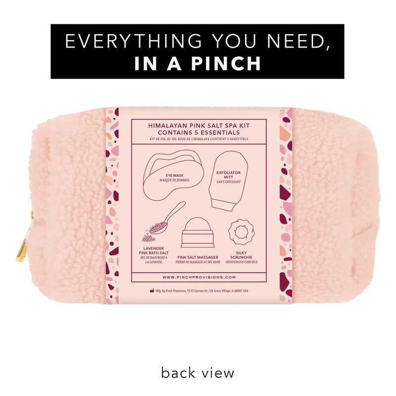 From work to family and everything in between, life can get quite stressful. Pinch Provisions is here for you! Indulge in weekend spa routine with the Himalayan Pink Salt Spa Kit that comes with 5 luxury spa essential items to help you relax!. Containing a set of well thought out spa items like the comfortable sherpa sleep eye mask, lavender pink bath salts, silky scrunchie, pink salt massager, and exfoliating mitt, the set makes for the perfect thinking of you care package for friends and family. All spa products come in a fluffy sherpa pouch that can be tucked away in your luggage or handbag, or kept on your bathroom shelf or on your vanity for everyday access. One of the best spa gifts for women, this kit is perfect for special occasions like birthday, Christmas, Valentine's Day, Women's Day, or simply for a slumber party or a girls night sleepover. Give it to all the ladies, be it mom or sister, wife, girlfriend or partner, best friend or boss.