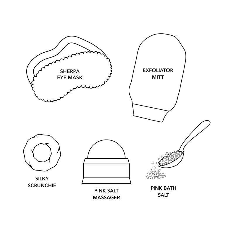 - SPA LA LA – It’s the perfect excuse to pamper yourself and others. Inside we have included 5 luxury spa essentials to bring the spa home with you like our Pink Himalayan Salt massage roller, a body exfoliating mitt, a soft sherpa eye mask, lavender bath salts, & a silky scrunchie to tie it all together