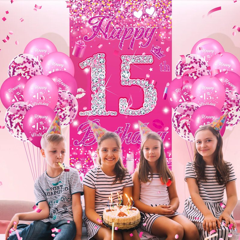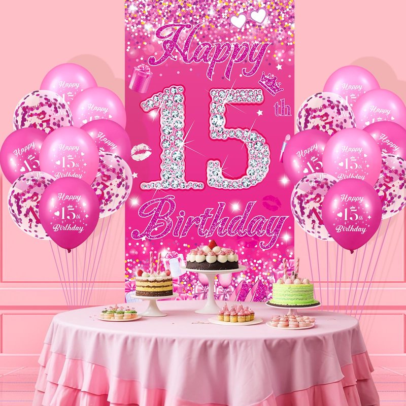 - 🌸【Easy to Use】The pink 15th birthday door cover with 4 copper holes, it can easily be hung with a rope; these pink and hot pink happy 15th birthday balloons can be filled with air or helium and you tie it on tables, chairs, gifts box, floor, etc, your party will be memorable for everyone