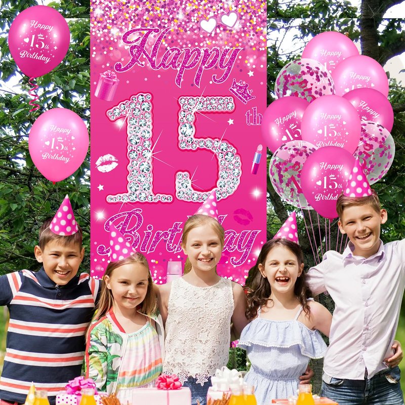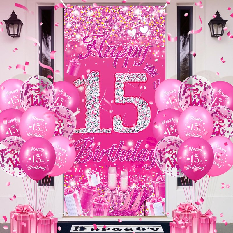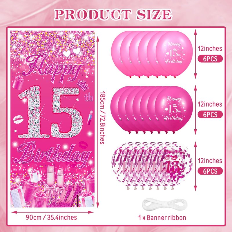 - 💗【Package Includes】You will get 1 pcs of hot pink happy 15th birthday door banner measures 72.8 x 35.4 inches (185 x 90 cm), 18 pcs of 12 inch pink "Happy 15th Birthday" latex balloons in 3 different colors (6pcs pink 15th birthday balloons, 6pcs hot pink 15th birthday balloons and transparent confetti 15th birthday balloons)
