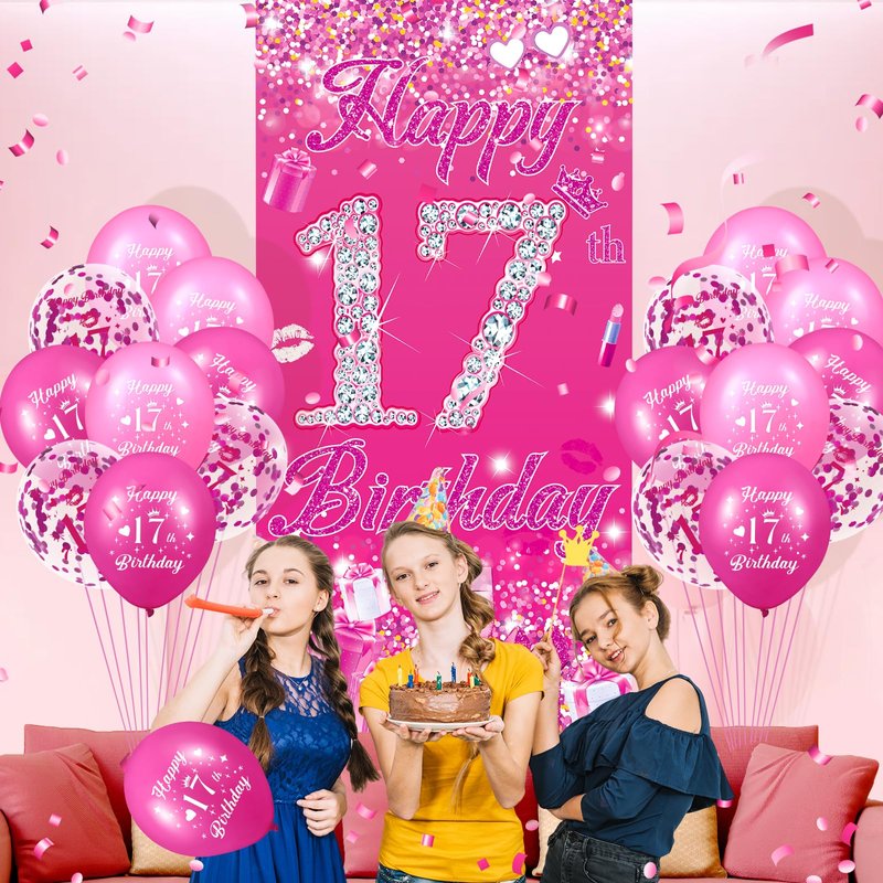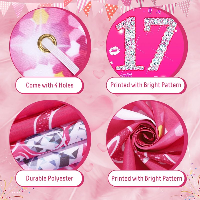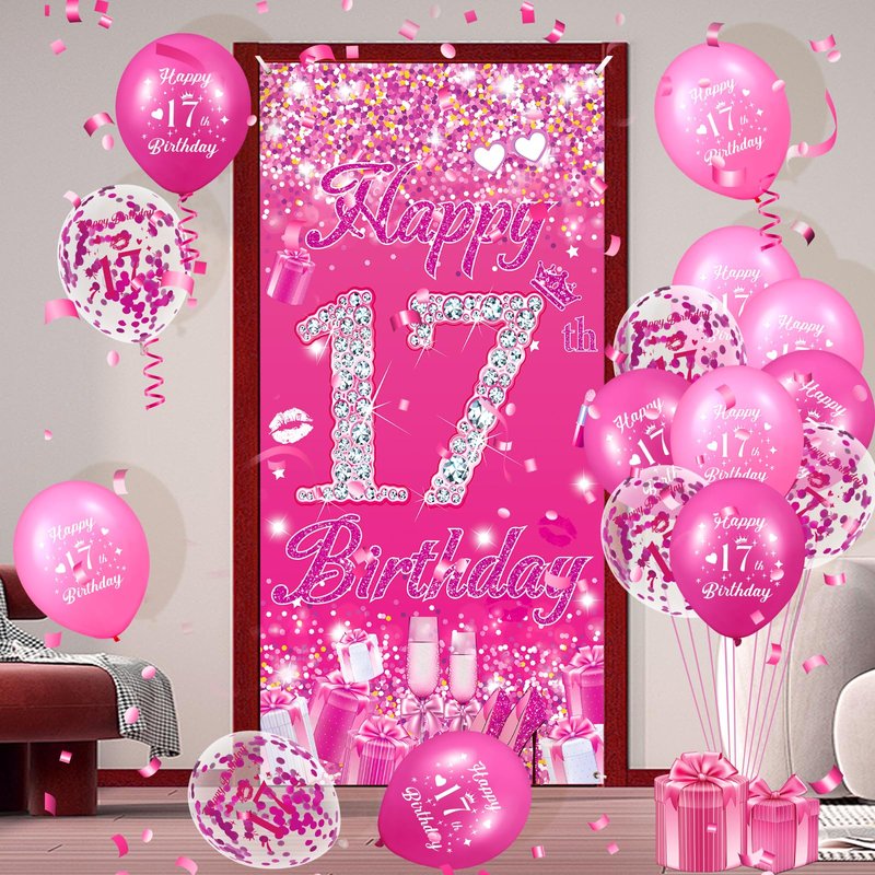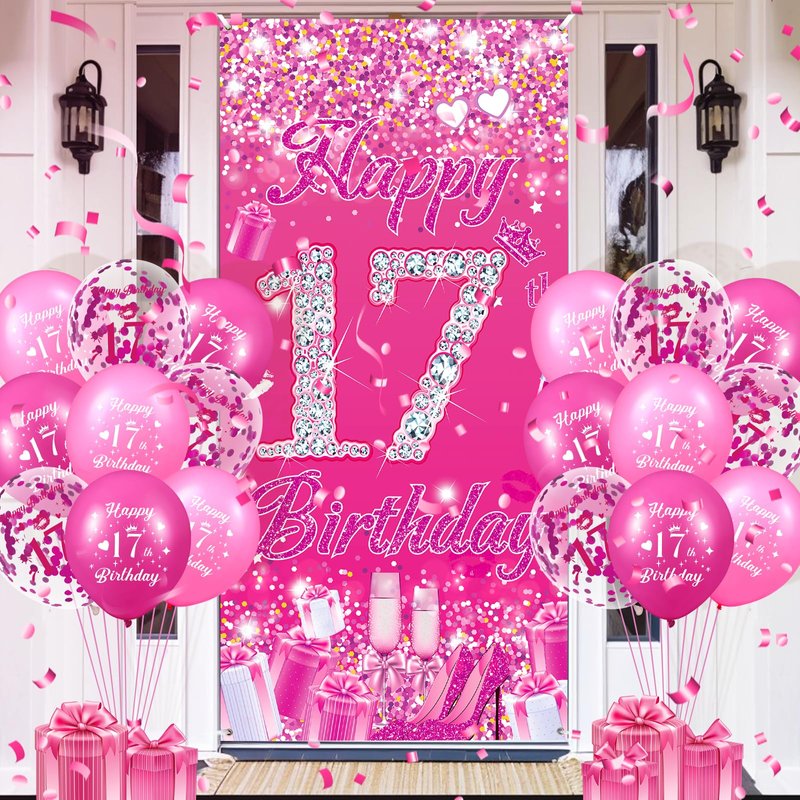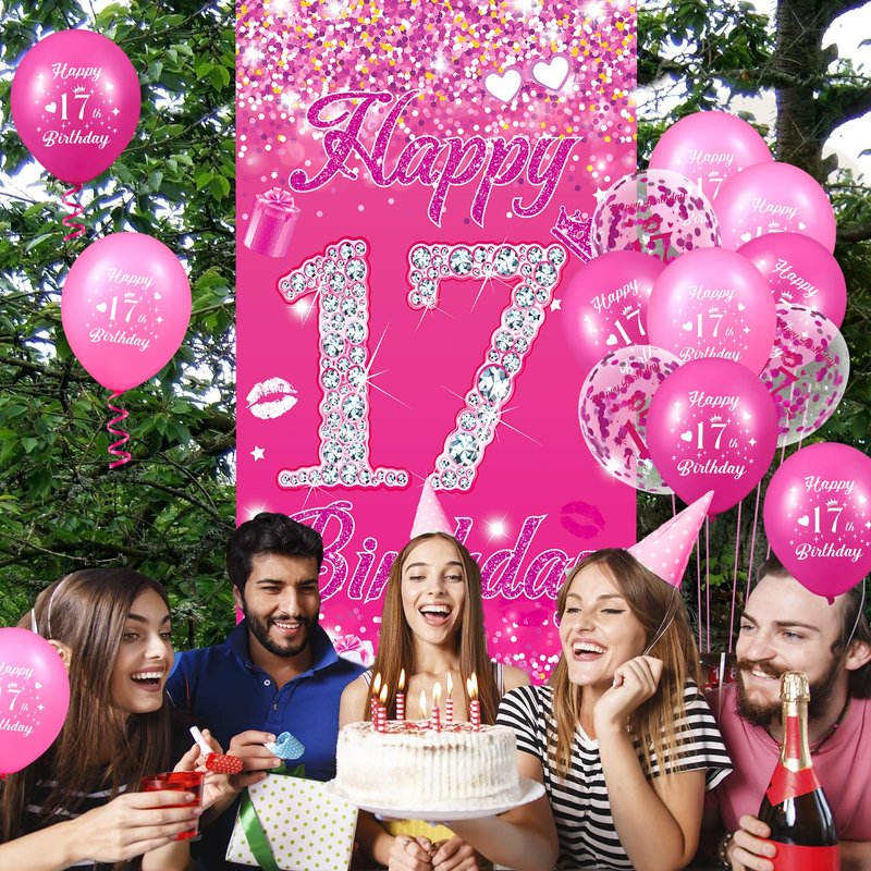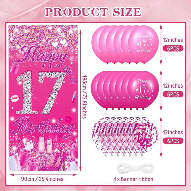 - Package Includes: You will get 1 pcs of hot pink happy 17th birthday door banner measures 72.8 x 35.4 inches (185 x 90 cm), 18 pcs of 12 inch pink "Happy 17th Birthday" latex balloons in 3 different colors (6pcs pink 17th birthday balloons, 6pcs hot pink 17th birthday balloons and transparent confetti 17th birthday balloons)