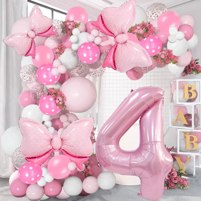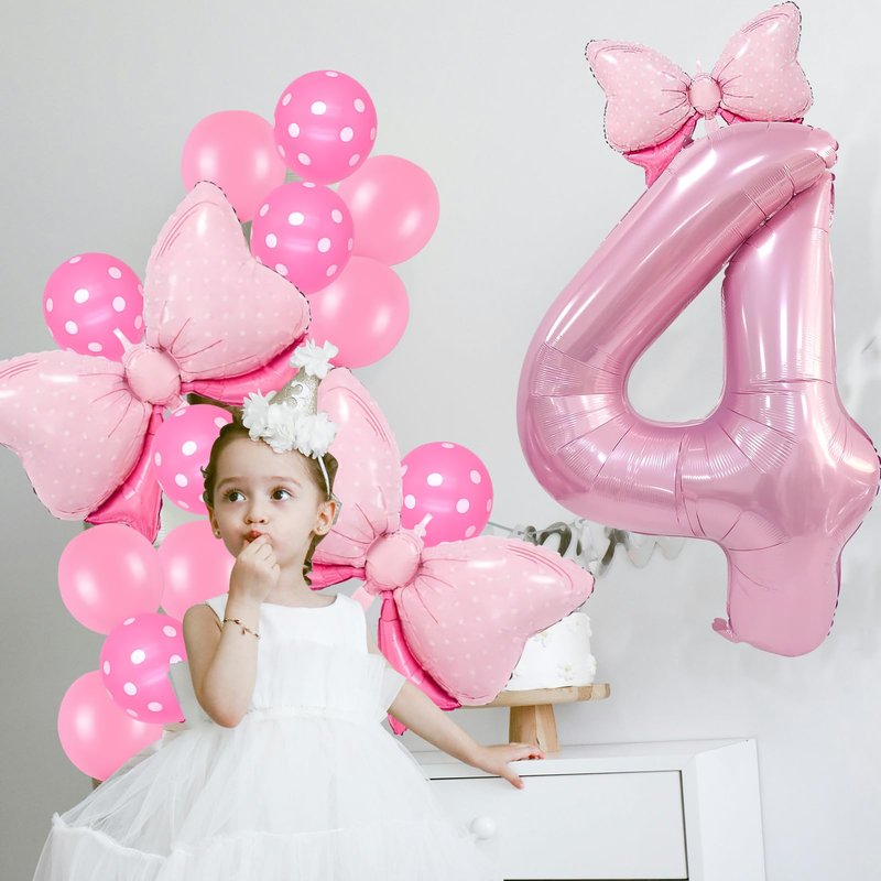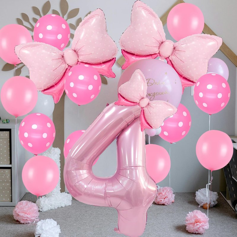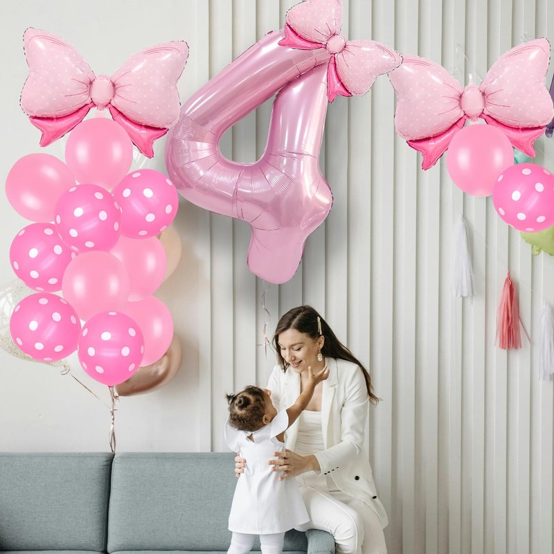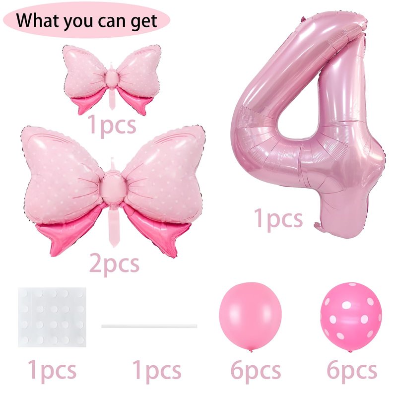 - Bow Birthday Party Supplies: This Bow Balloon 4 th birthday party supplies set includes a giant 40" number 4 balloon, 2 pcs 27*20" and 1 pcs 16" Bow balloon, 6 pcs 12“ Polka dot balloon, 6 pcs 12" Pink Balloons