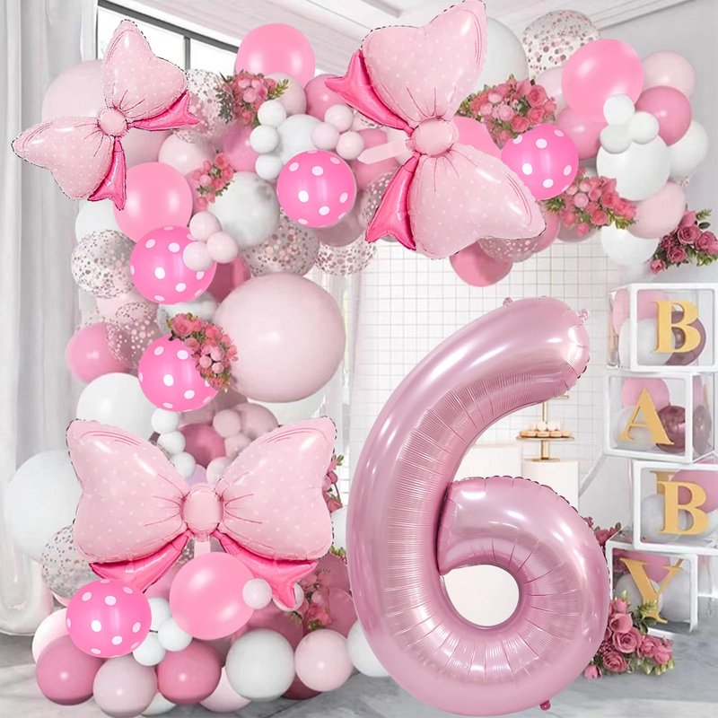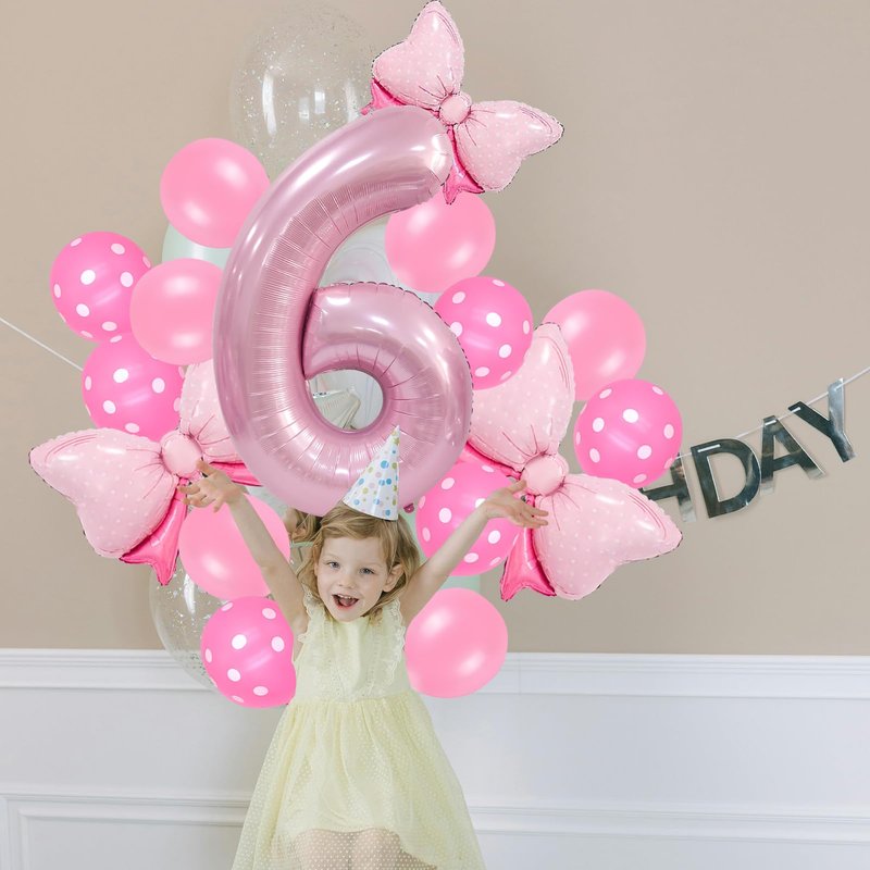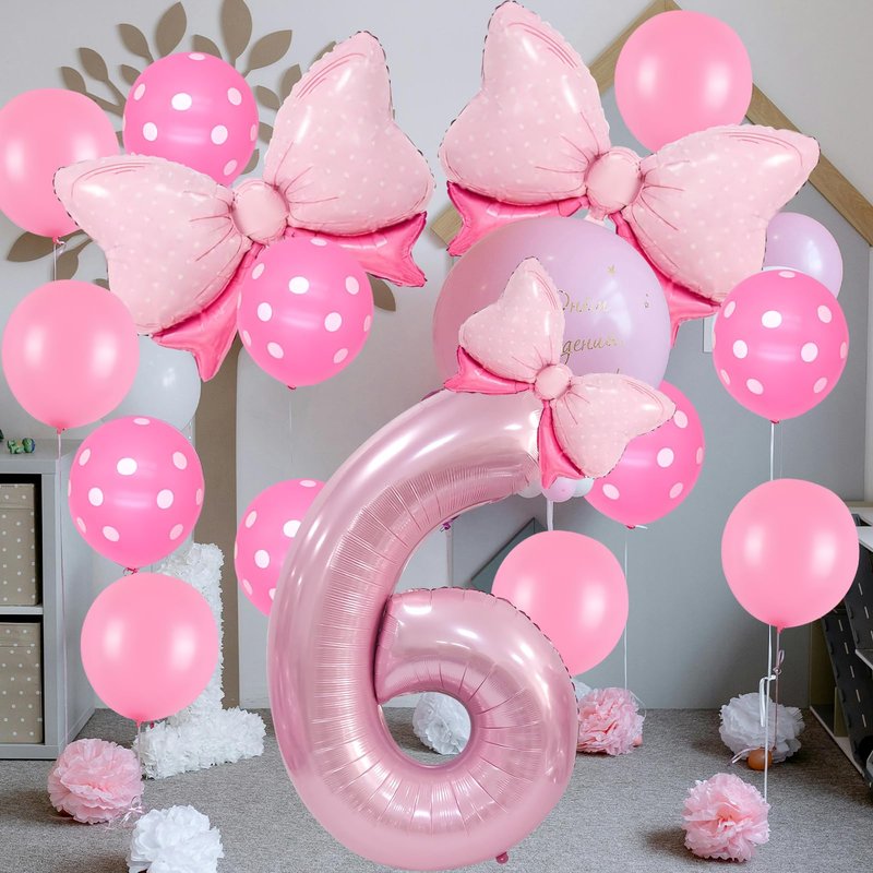 - Bow Birthday Party Supplies: This Bow Balloon 6 th birthday party supplies set includes a giant 40" number 4 balloon, 2 pcs 27*20" and 1 pcs 16" Bow balloon, 6 pcs 12“ Polka dot balloon, 6 pcs 12" Pink Balloons