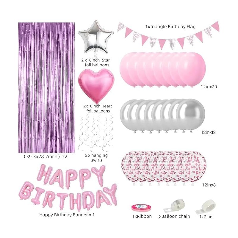 1 pink foil happy birthday banner, 20pcs pink balloons (12 inches), 12pcs silver balloons (12 inches), 8pcs pink silver confetti balloons (12 inches), 2pcs pink foil balloons (heart and star) (18 inches), 2pcs silver foil balloons (heart and star) (18 inches), 2 shiney pink tassel curtains (3.28 X 6.56 feet), 6pcs silver hanging swirls, 1pcs decorative strip, 1pcs ribbon, 1 x roll of glue (100 points in total).