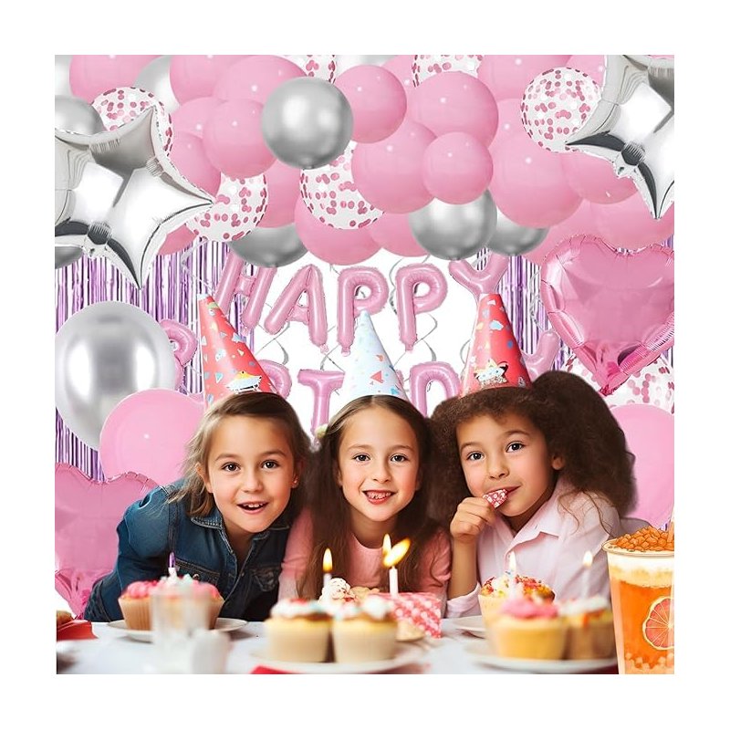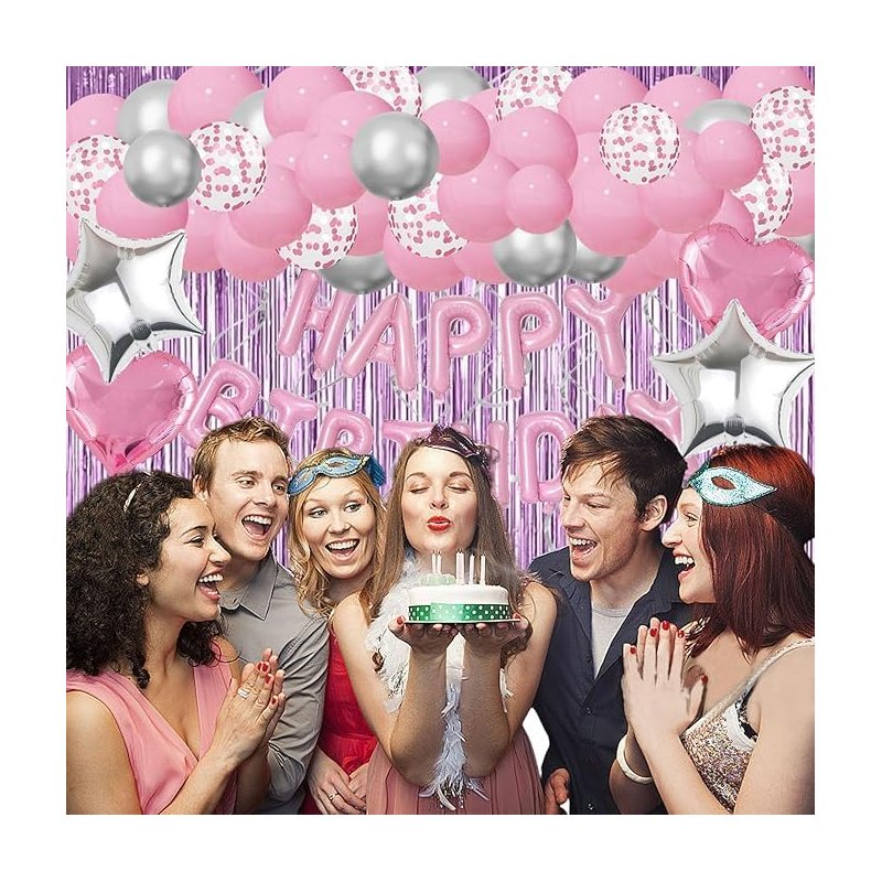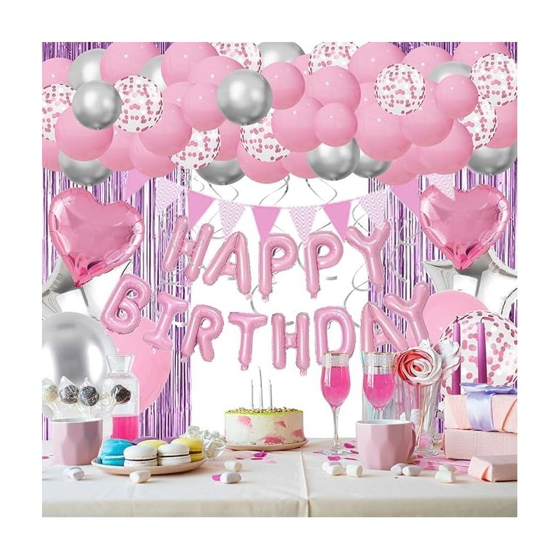 - 【PINK BIRTHDAY DECORATIONS INCLUDE】 1 pink foil happy birthday banner, 20pcs pink balloons (12 inches), 12pcs silver balloons (12 inches), 8pcs pink silver confetti balloons (12 inches), 2pcs pink foil balloons (heart and star) (18 inches), 2pcs silver foil balloons (heart and star) (18 inches), 2 shiney pink tassel curtains (3.28 X 6.56 feet), 6pcs silver hanging swirls, 1pcs decorative strip, 1pcs ribbon, 1 x roll of glue (100 points in total).