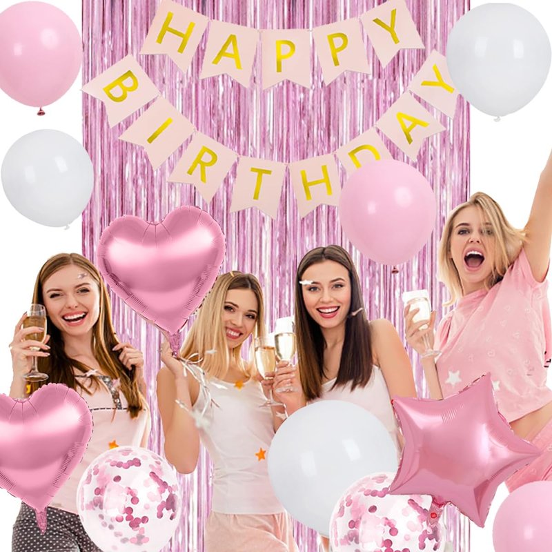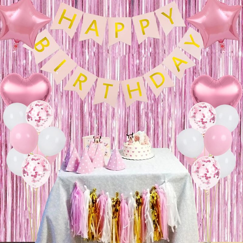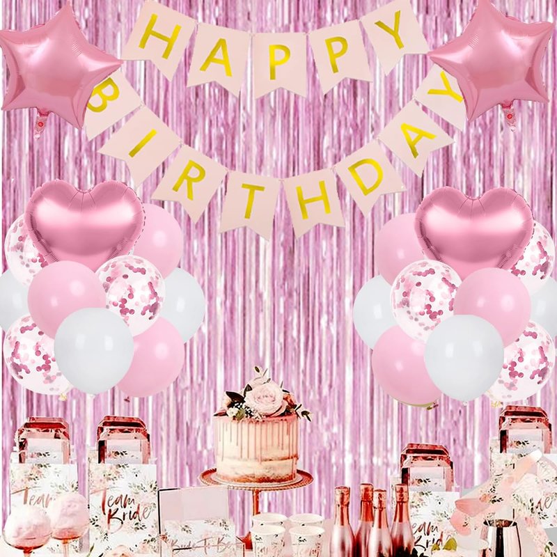 - PRETTY GIRL BIRTHDAY DECORATION: The pink birthday decorations package is such a beautiful color! There are stunning pink white balloons for making a balloon arch. pink fringe curtain make a decoration wall, pink white confetti balloon and happy birthday banner supplies all included. the pink white are also very agree with women's themes. I believe our pink birthday party decoration will definitely become the focal of your party!