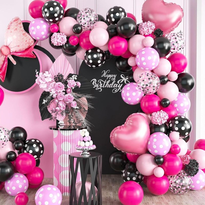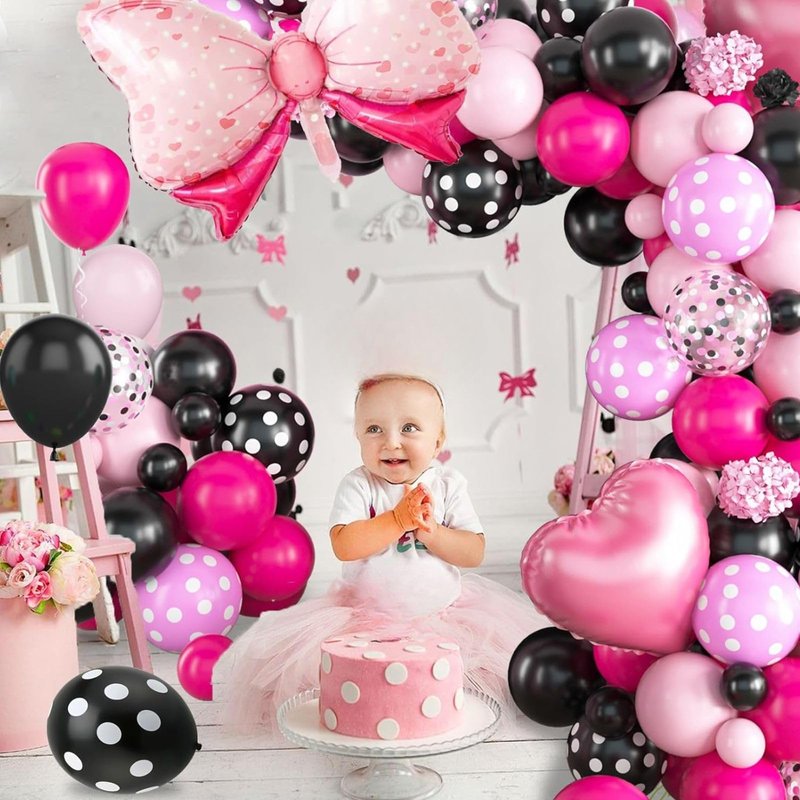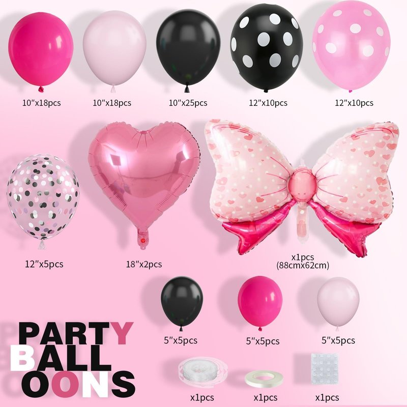- Elegant Design: Our mini mouse balloon arch kit are designed to add a touch of elegance to your event! The balloon garland includes 10inch: 25 x black, 18 x rose red, 18 x pink, 5inch: 5 x black, 5 x rose red, 5 x pink, 12inch:1 x black dot, 1 x pink dot balloons; 2 x 18inch pink heart foil balloons, 1 x bow tie foil balloons; 1x balloon strip, 1x dispensing, 1x ribbon.