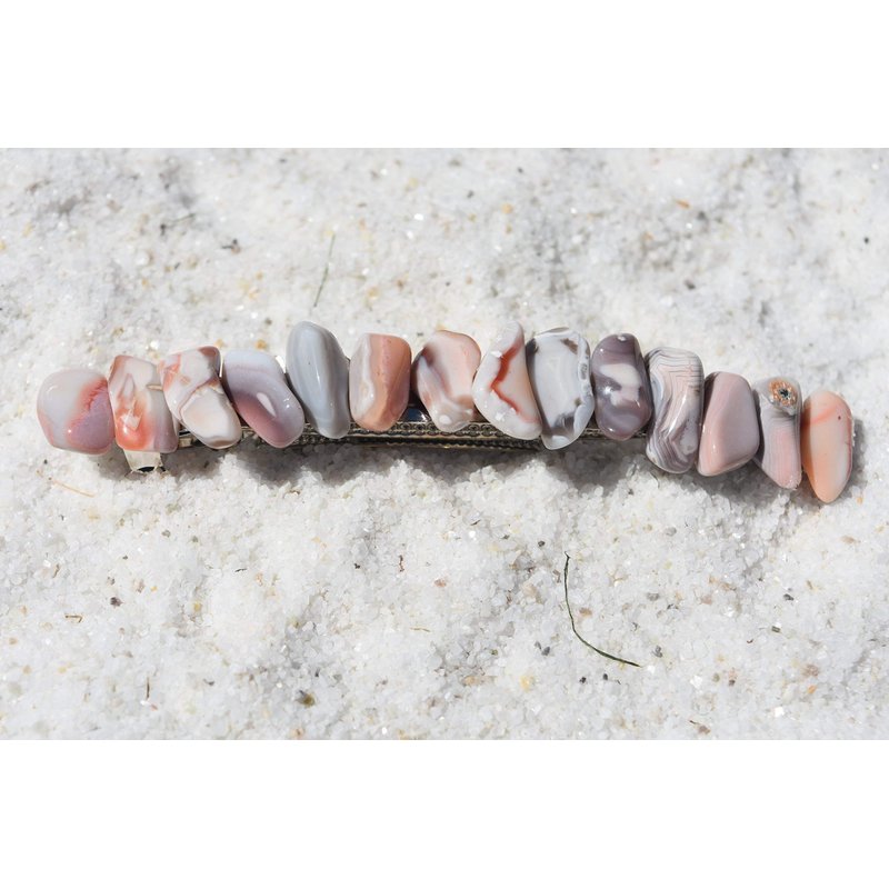 Pretty pink Botswana agate stone french barrette, the stones have a gorgeous pink coloring. The stone french barrettes are adorned with pink Botswana agate stones. The pink Botswana agate stone hair clip is the perfect accessory for a night out, and can dress up an outfit or be used for a special event, like a quinceanera, first communion, or even a wedding. The hair clip is hand made in the USA and come from a smoke free environment. The pink Botswana agate stone hair clip measure: 100 mm x 35 mm x 40 mm or 4 inches x .55 inches x .57 inches.