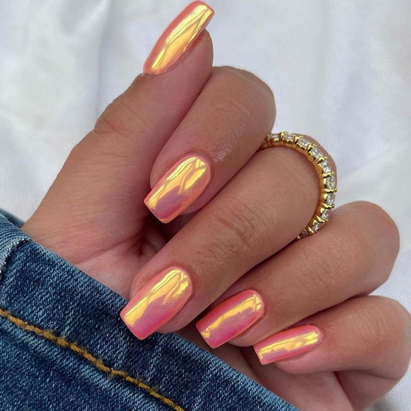 Pink Chrome Press on Nails Medium Square Fake Nails Aurora False Nails with Design Glossy Glue on Nails Bright Shiny Acrylic Nails Pearl Flash Artificial Nails for Women Nail Art Decoration 24pcs