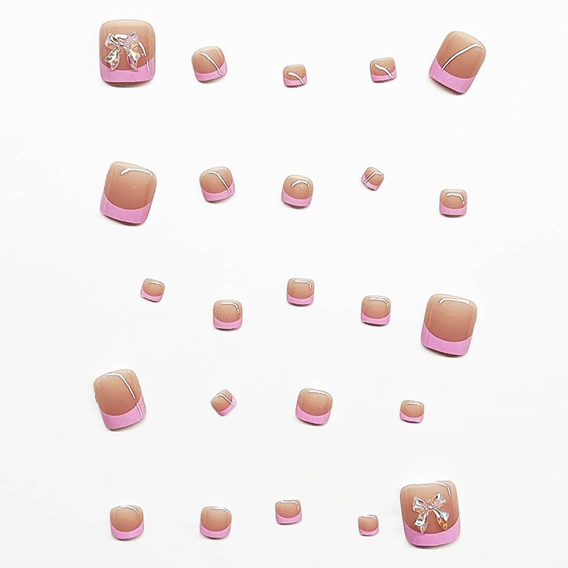 Pink French Tip Press on Toenails for Women, Bow Fake Toe Nails Short Square Glue on Toenails 3D Bows Acrylic Toenails Cute Full Cover Stick on Toenails Pink Toe Nail Tips Summer False Toenails