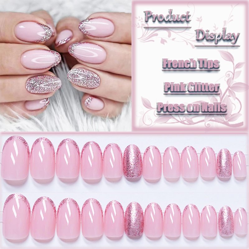 Pink Glitter French Tips Short Almond Press on Nails with Sparkly Design, Glossy Acrylic False Nails Gel Glue on Nails, Shine Manicure Art Fake Nails Stick on Nails for Women Girls