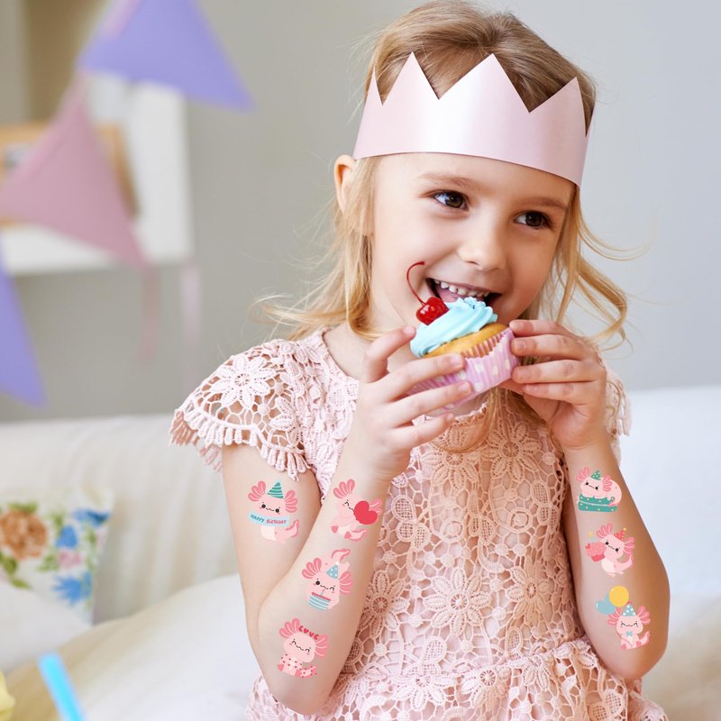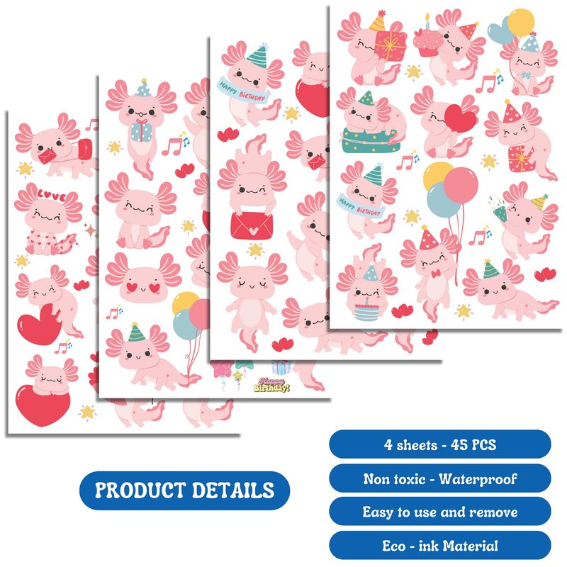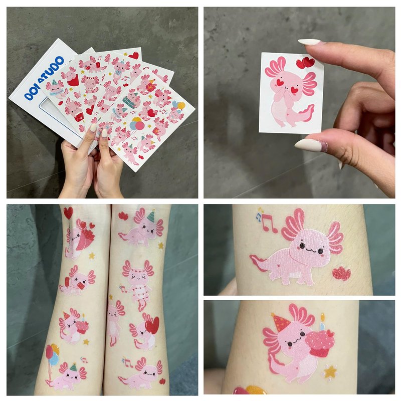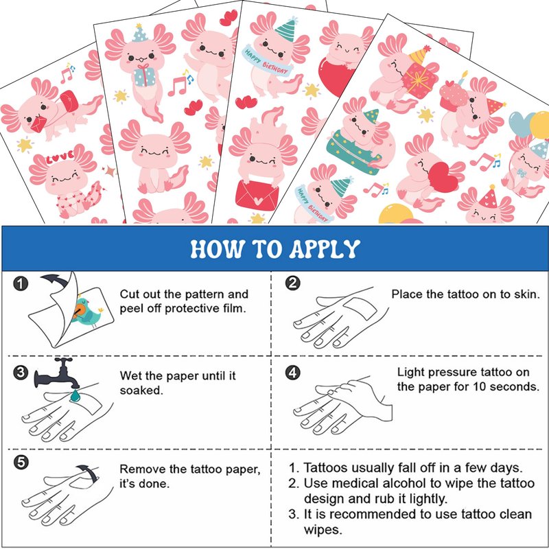 - AXOLOLT PARTY DECORATIONS: 4 sheets axololt theme temporary tattoos stickers with 85 different patterns, variety of themed characters bring many interesting times, meet your decoration needs.