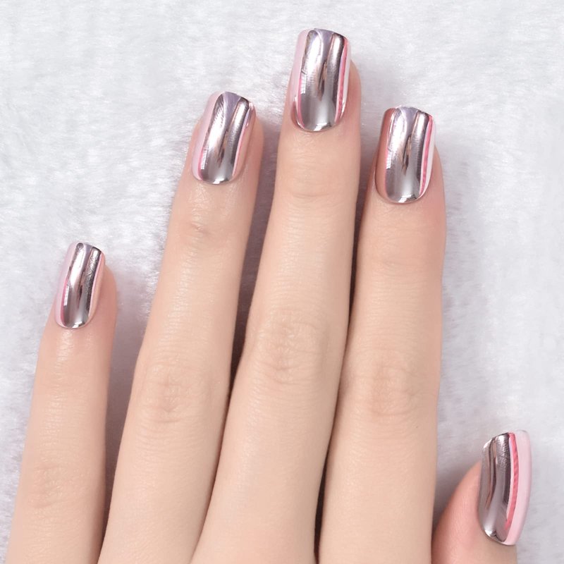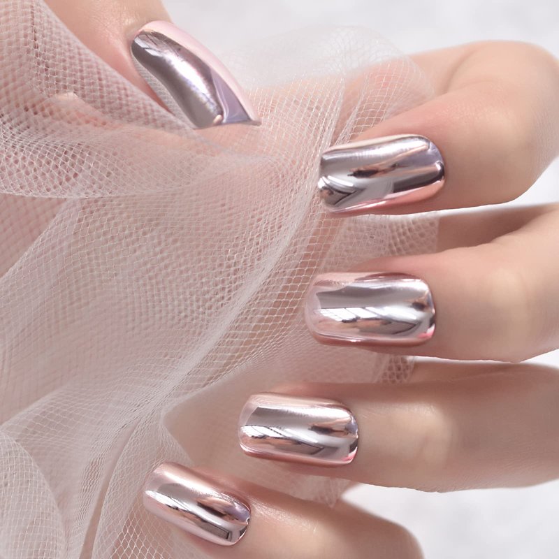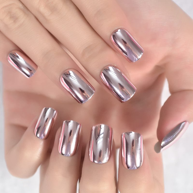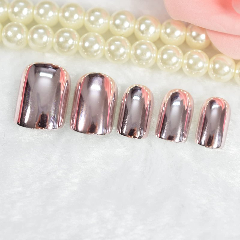 Pink Metallic Fake Nails Short Full Cover Mirror Salon False Nail Art Tips for Women Decoration