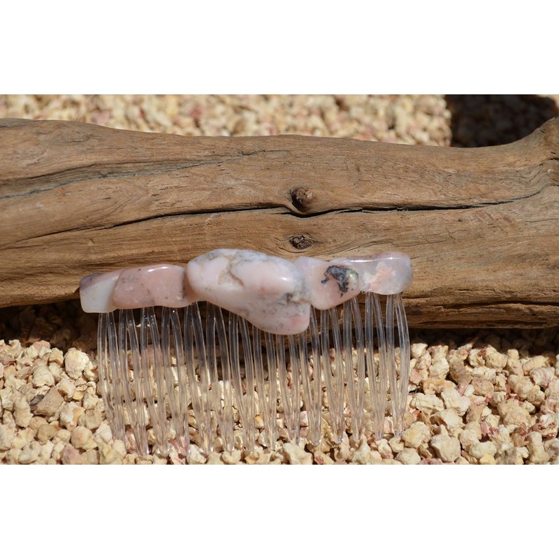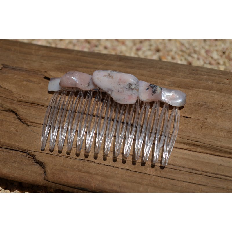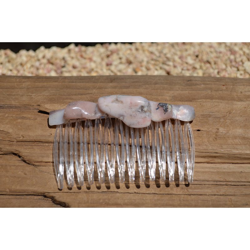 Pretty pink opal stone hair comb, the stones have a gorgeous pink hue. The pink opal stone hair comb is adorned with small tumbled pink opal stones. The pink opal hair comb is the perfect accessory for a night out, and can dress up an outfit or be used for a special event, like a quinceanera, first communion, or even a wedding. The hair comb is hand made in the USA and come from a smoke free environment The pink opal hair combs measure: 67 mm x 41 mm or 2.65 inches x 1.6 inches