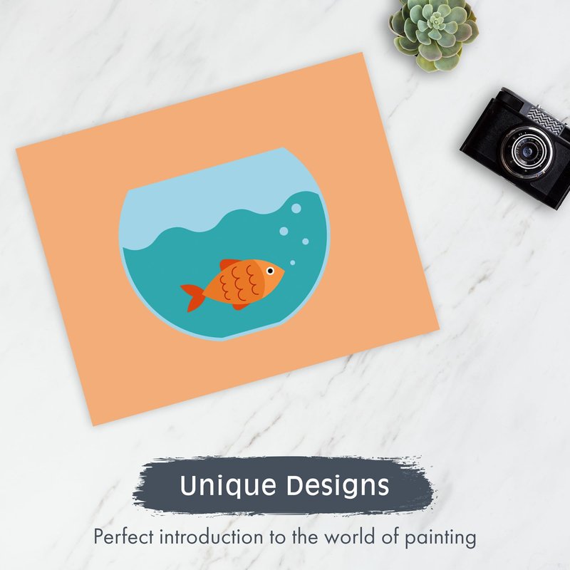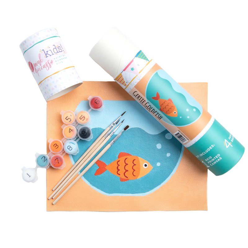 - 🎨PACKAGE INCLUDES: Our Pink Picasso Kits Kids Gertie Goldfish Painting Art Crafts includes everything you need to get started, including: -A high-quality canvas with a beautifully detailed, Cute Goldfish in a bowl theme design with pre-printed canvas that is divided into numbered sections. Each section corresponds to a specific paint color, making it easy to follow along and create your masterpiece. -A set of premium pre-mixed water-based acrylic paints, and -Four brushes in different sizes