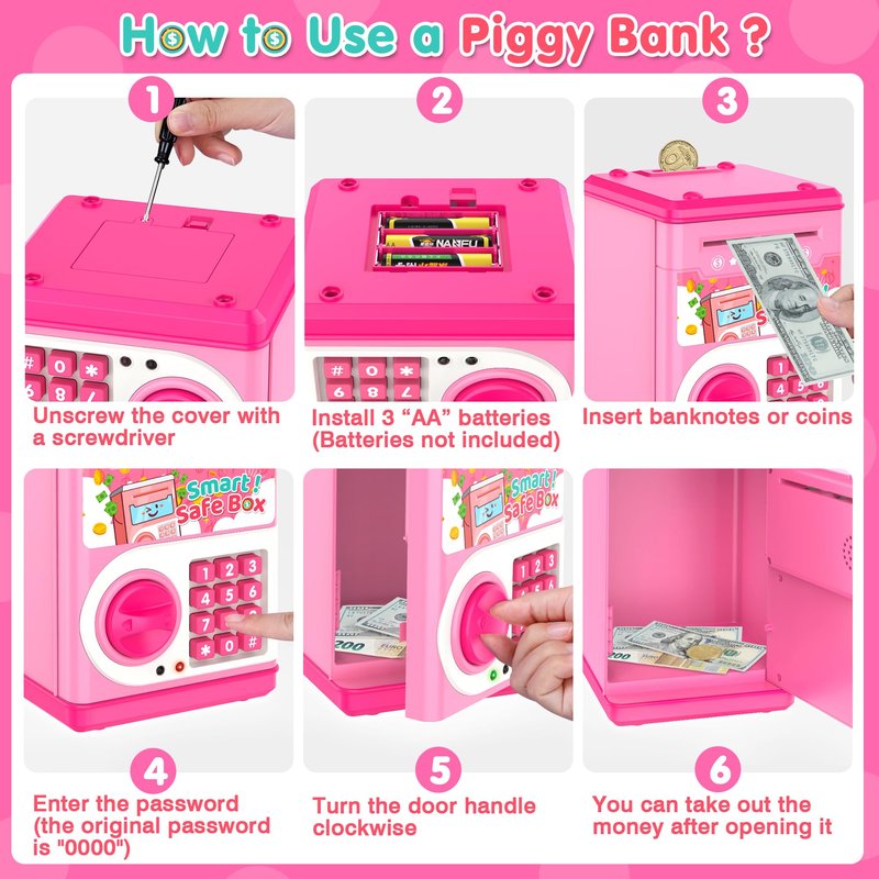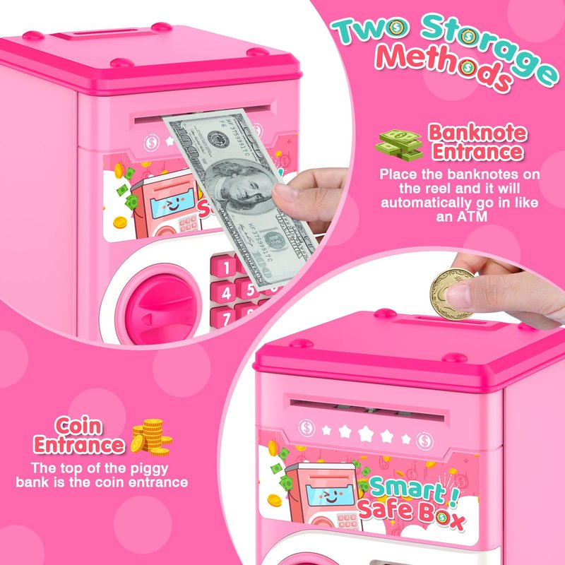 - Children's piggy banks usually have a small opening for inserting coins or banknotes. Insert the paper money into the slot on top of kid's ATM money bank, it can be rolled into the ATM machine automatically. Easy for kids to use.(But it doesn't work if the paper is too old or too soft)