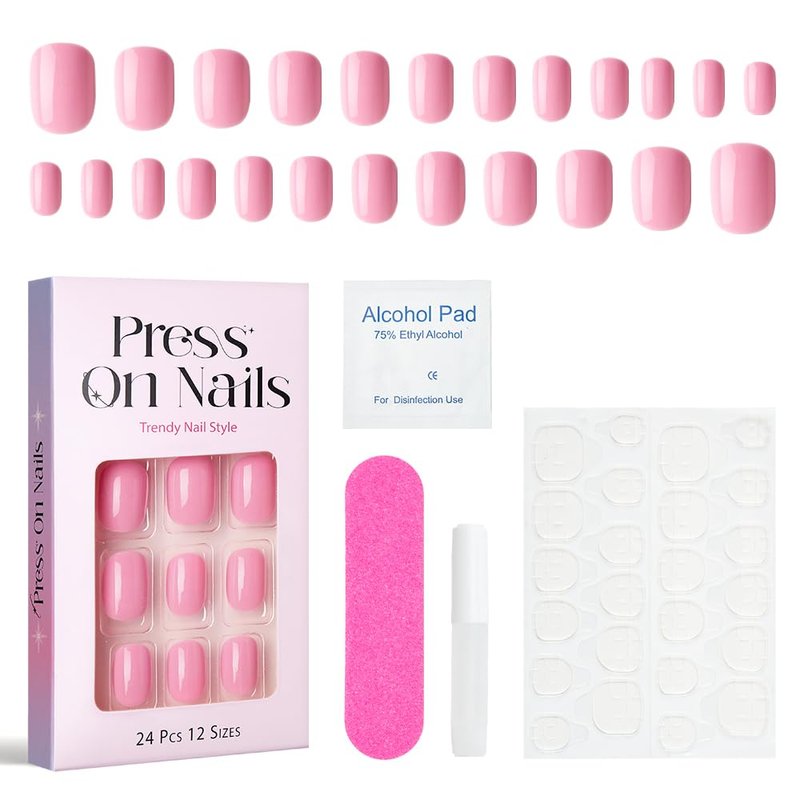 Pink Press On Nails Short Square with Nail Glue Kit Reusable Baby Pink Fake Elegant Nails False Nail Set Jelly Glue Nail File 12 Sizes 24pcs