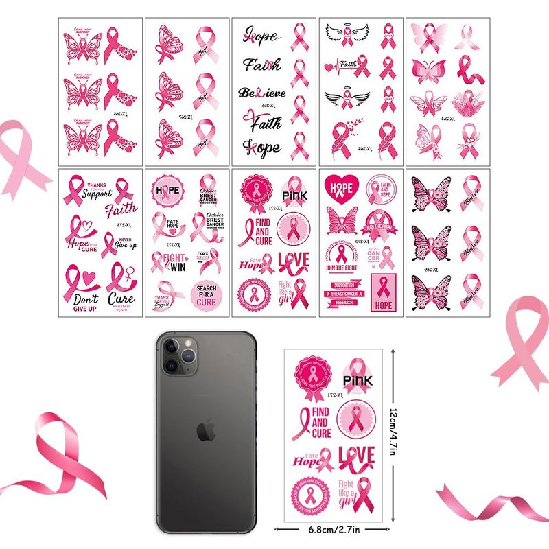 - Package includes:Comes with 10 sheet various styles of breast cancer awareness stickers, you can share them with your family and apply them to makeup together!Each sheet tattoo size is 4.7x2.8inch/12x7cm.
