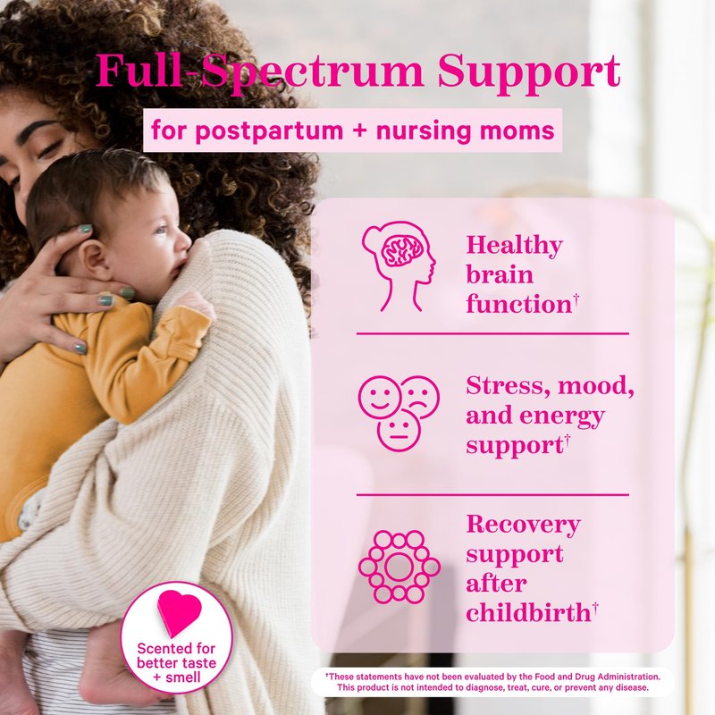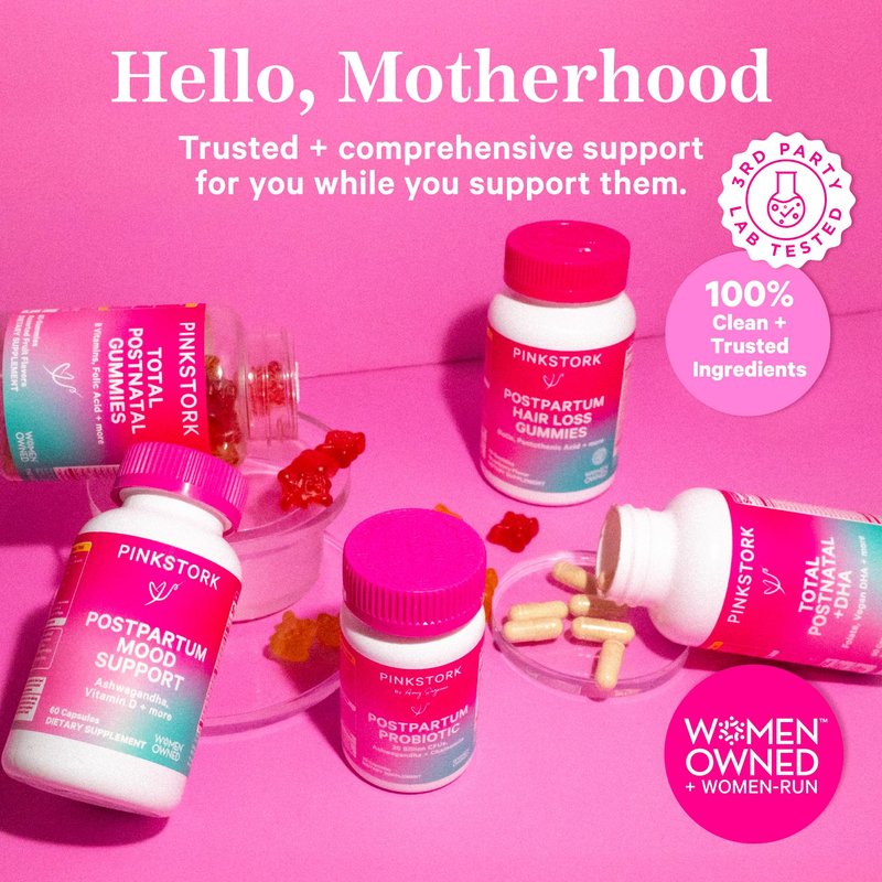 - When women start this new chapter of motherhood, we focus on the baby - let Pink Stork focus on you! Our blend of 20 vitamins, nutrients, and minerals includes Iron, Folate, B Vitamins, Biotin, and vegan Omega-3 DHA to support postpartum recovery. Take two small capsules as part of your postpartum ritual for mood health, balanced energy levels, and immune health.